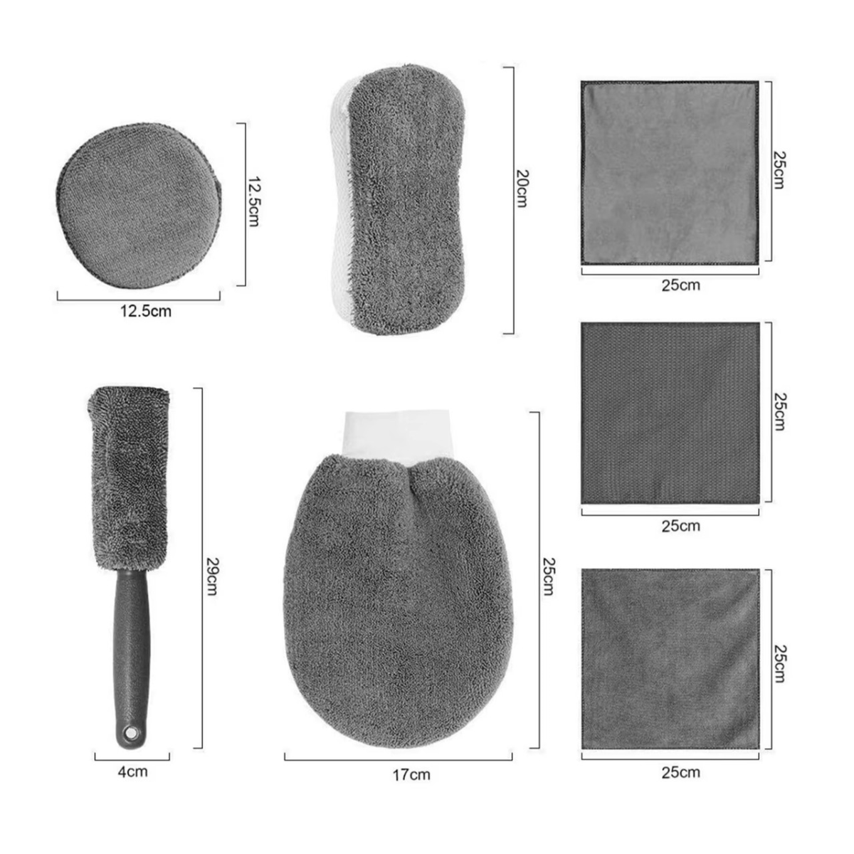 Ролик зі зручною ручкою стане незамінним інструментом для чищення колісних дисків і шин, допомагаючи швидко видалити бруд і пил. Три полірувальних диска ідеально підходять для нанесення воску, догляду за пластиком у салоні та створення бездоганного блиску. Мікрофіброві серветки з антистатичним ефектом різного плетіння допоможуть у прибиранні салону, чищенні стекол, дзеркал і фар, а також догляду за пластиковими елементами автомобіля.