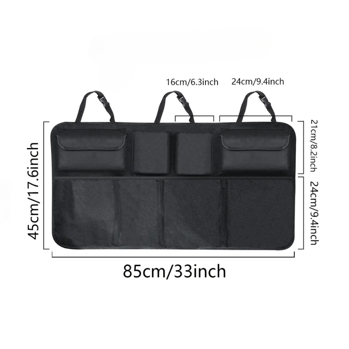 Органайзер на задній ряд сидінь ідеально підходить для зберігання різних предметів під час поїздок. Його розміри 45х85 см і універсальний чорний колір роблять його придатним для будь-якого типу кузова автомобіля. Виготовлений з міцної вологозахисної тканини Оксфорд, він легко чиститься і служить тривалий час. Органайзер має 8 зручних кишень для зберігання речей. Верхній ряд містить кишені заввишки 21 см і завширшки 16-24 см, що ідеально підходять для дрібних аксесуарів. Нижній ряд представлений сітчастими кишенями з гумкою для щільної фіксації, висотою 24 см, які підходять для зберігання пляшок, іграшок або інших об“ємних предметів. Завдяки продуманій конструкції, ваші речі будуть надійно закріплені під час руху. Кріплення організатора здійснюється на три підголівники заднього ряду сидінь за допомогою пластикових карабінів на ременях, що забезпечує легкість установки і надійність фіксації. Це практичне рішення для сімейних поїздок, подорожей або повсякденної експлуатації автомобіля. Особливості: Матеріал: щільна тканина Оксфорд. Розміри: 45х85 см. 8 кишень: верхні кишені (21х16-24 см) і нижні сітчасті кишені з гумкою (24 см). Легке очищення і захист від вологи. Просте кріплення на 3 підголівники за допомогою пластикових карабінів.