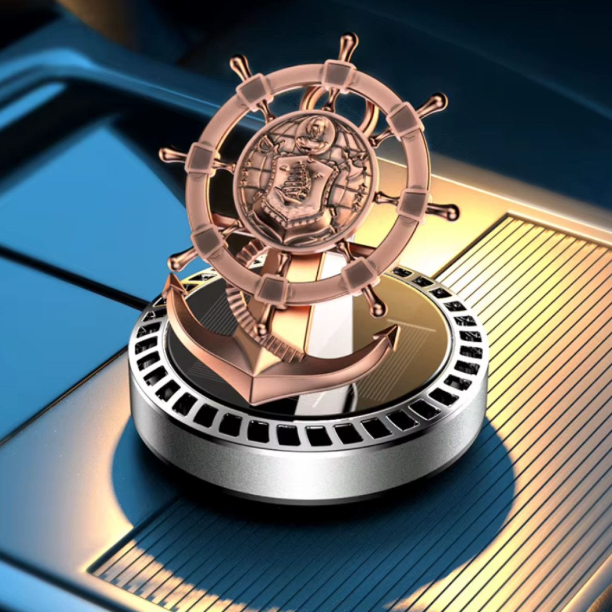 Ароматизатор «Корабельний штурвал» на сонячній батареї, сріблястий Морська тематика та свіжість Елегантний ароматизатор у вигляді корабельного штурвала стане вишуканим акцентом в інтер“єрі вашого автомобіля. Фігурку штурвала з якорем виконано в бронзовому кольорі, а платформу - в стильному сріблястому, що створює гармонійне поєднання морської естетики та сучасного дизайну. Інноваційна робота на сонячній енергії Штурвал починає обертання під час потрапляння сонячних променів, завдяки вбудованій сонячній батареї. Цей ефект не тільки заворожує своїм виглядом, а й сприяє рівномірному поширенню аромату «Океан», наповнюючи салон свіжістю та комфортом, створюючи відчуття легкості та свободи. Практичність і якість у деталях Ароматизатор виготовлено з міцного алюмінію, що забезпечує його довговічність і стійкість до зовнішніх впливів. Універсальна установка досягається за рахунок платформи з липкою основою, яка легко фіксується на будь-якій поверхні. Компактні розміри (8х7,5 см) і легка вага (200 г) роблять пристрій зручним у використанні. Особливості: Робота від сонячної батареї: штурвал, що обертається під час потрапляння сонячних променів. Стильний дизайн: штурвал бронзового кольору і срібляста платформа. Аромат «Океан»: свіжість і морська атмосфера в салоні. Компактність: розміри 8х7,5 см, вага 200 г. Матеріал: ударостійкий алюміній. Універсальна установка: липка основа для надійного кріплення.