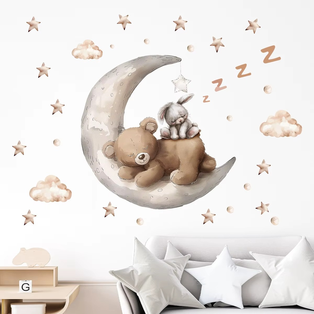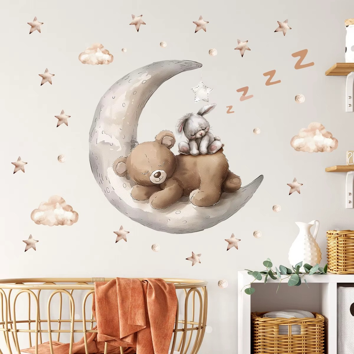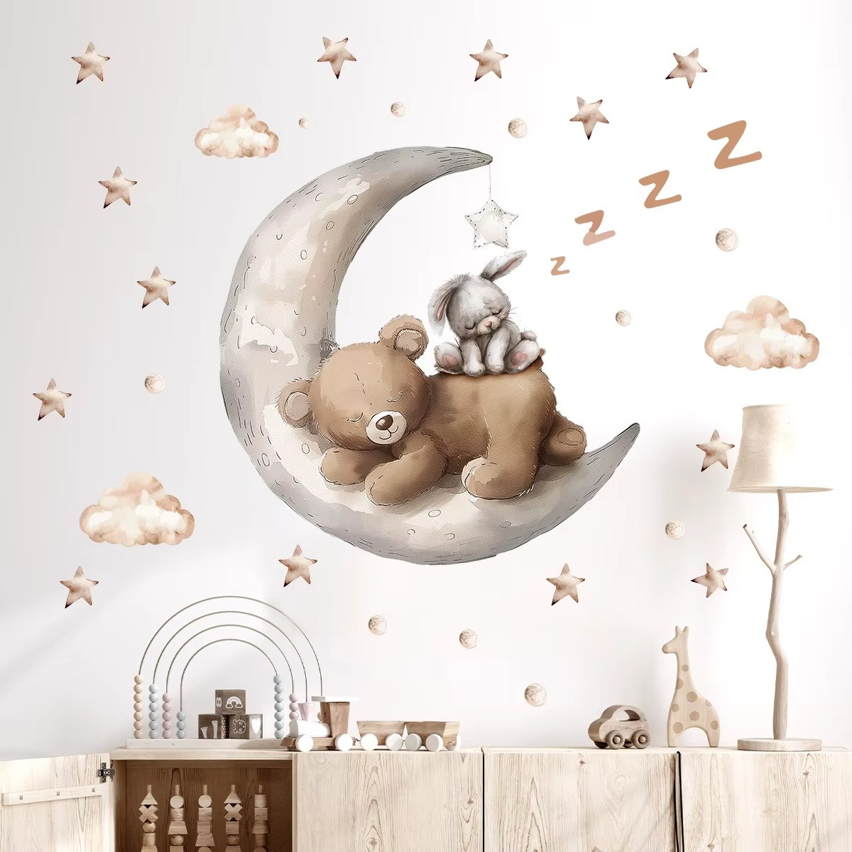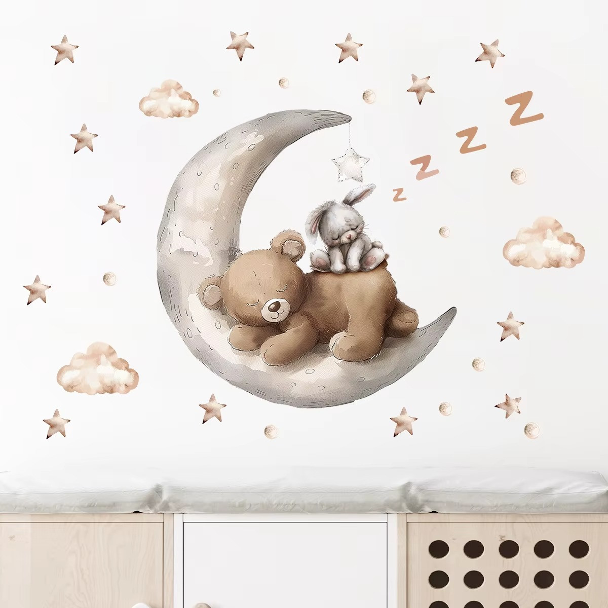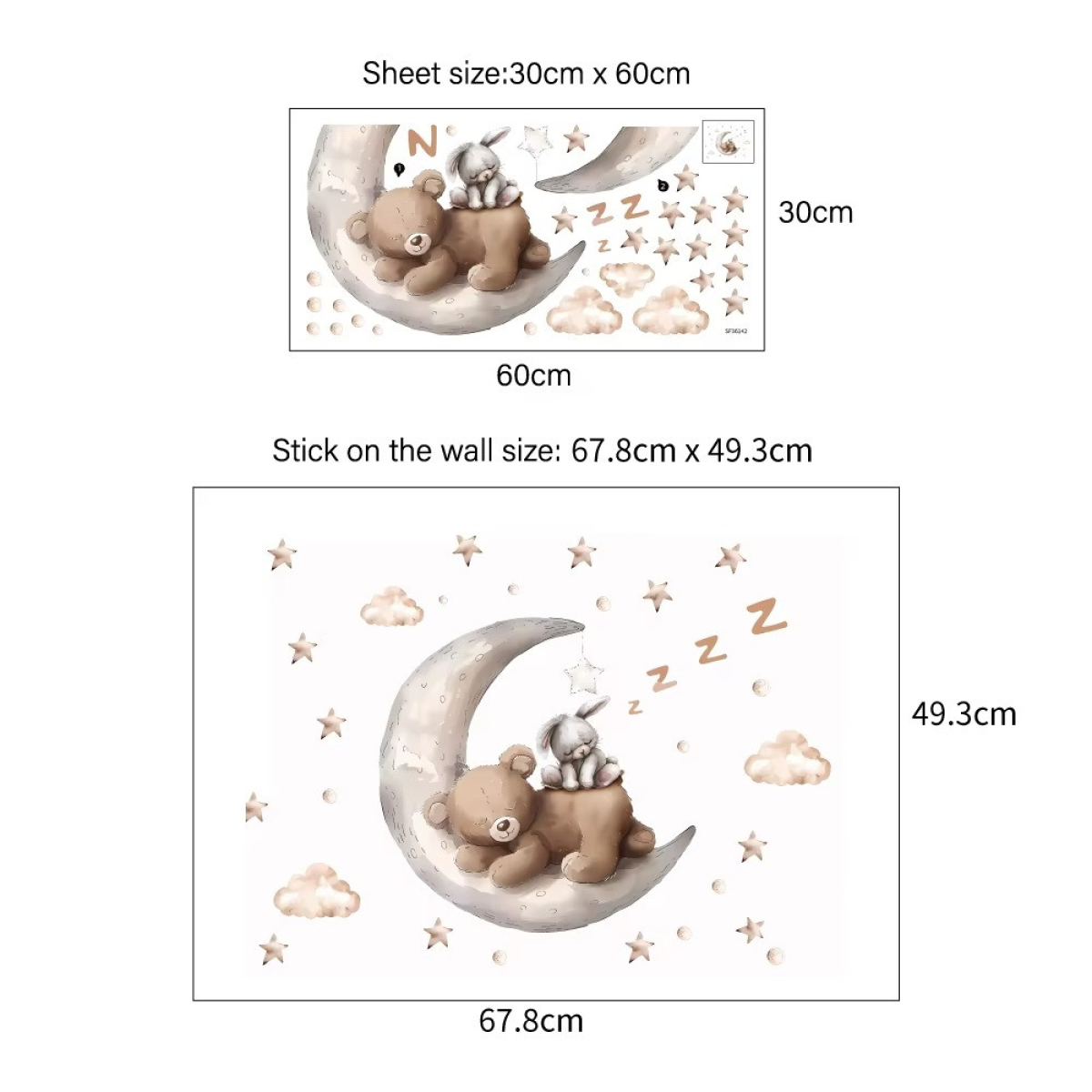 Наклейка декоративна вінілова в дитячу кімнату «Ведмедик із зайчиком на Місяці» для дівчаток і хлопчиків 30х60 см