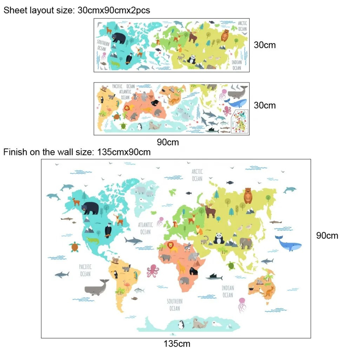 Створіть атмосферу подорожей і відкриттів у кімнаті вашої дитини за допомогою набору вінілових наклейок «Карта Світу». Цей декоративний елемент об“єднує пізнавальний і розважальний аспекти, перетворюючи інтер“єр на захопливу карту світу. Кожен материк виділено унікальним кольором, а океани і материки підписані англійською мовою, що сприяє навчанню дитини. Карта наповнена барвистими зображеннями тварин, що відображають їхні місця проживання. Це робить наклейку не тільки естетичною прикрасою, а й освітнім інструментом, що допомагає дитині вивчати фауну різних куточків планети. Розмір набору - два елементи 30х90 см, які легко розмістити на стіні, створюючи яскраву композицію. Вінілові наклейки виконані з високоякісного матеріалу ПВХ, який легко наноситься на гладкі поверхні та знімається без слідів. Завдяки яскравим і стійким кольорам, наклейки будуть радувати око довгі роки, залишаючись незмінною частиною декору. Особливості товару: Набір складається з двох наклейок розміром 30х90 см. Підписи материків і океанів англійською мовою. Унікальна колірна палітра для кожного материка. Зображення тварин та їхнього середовища існування. Легкість нанесення та видалення завдяки матеріалу ПВХ.