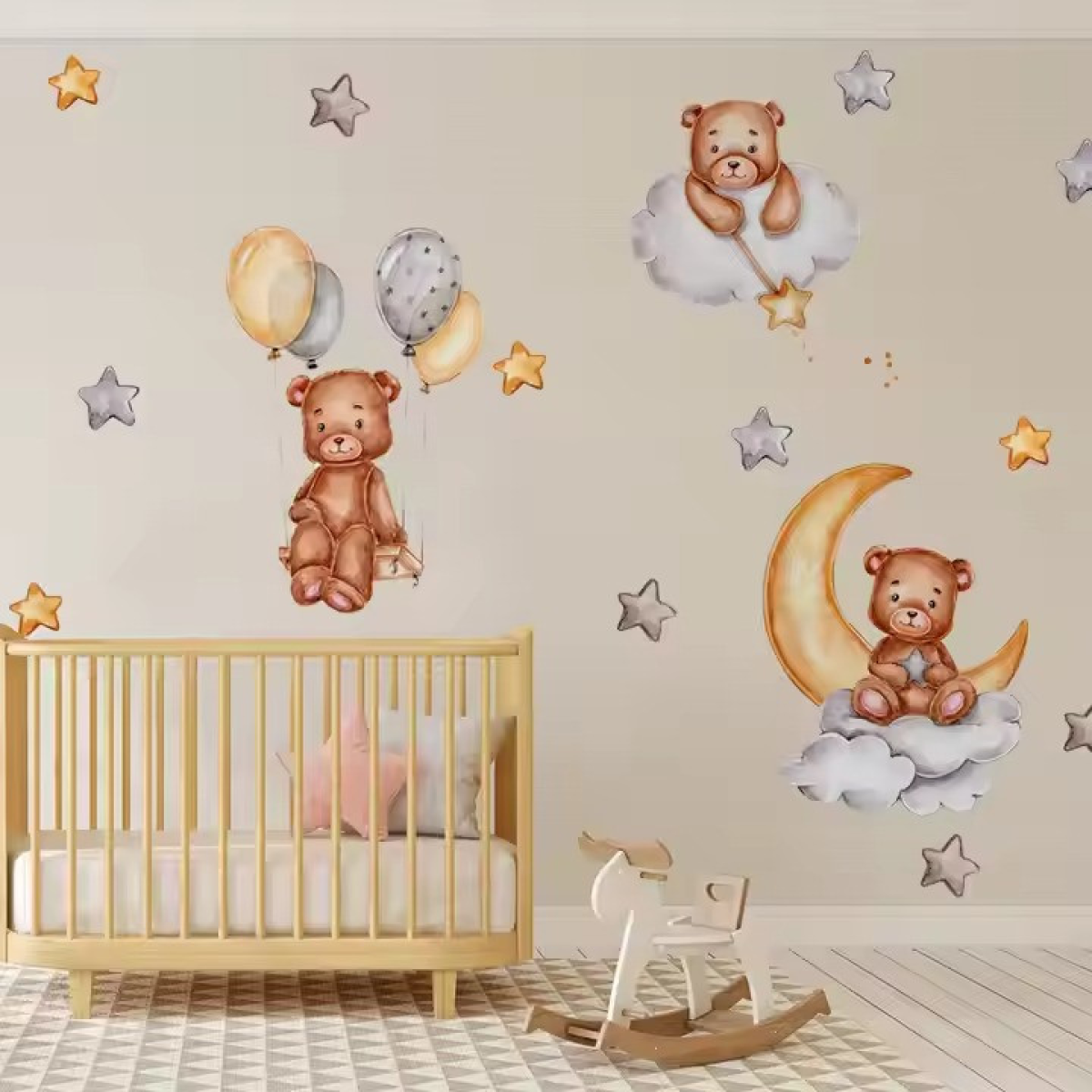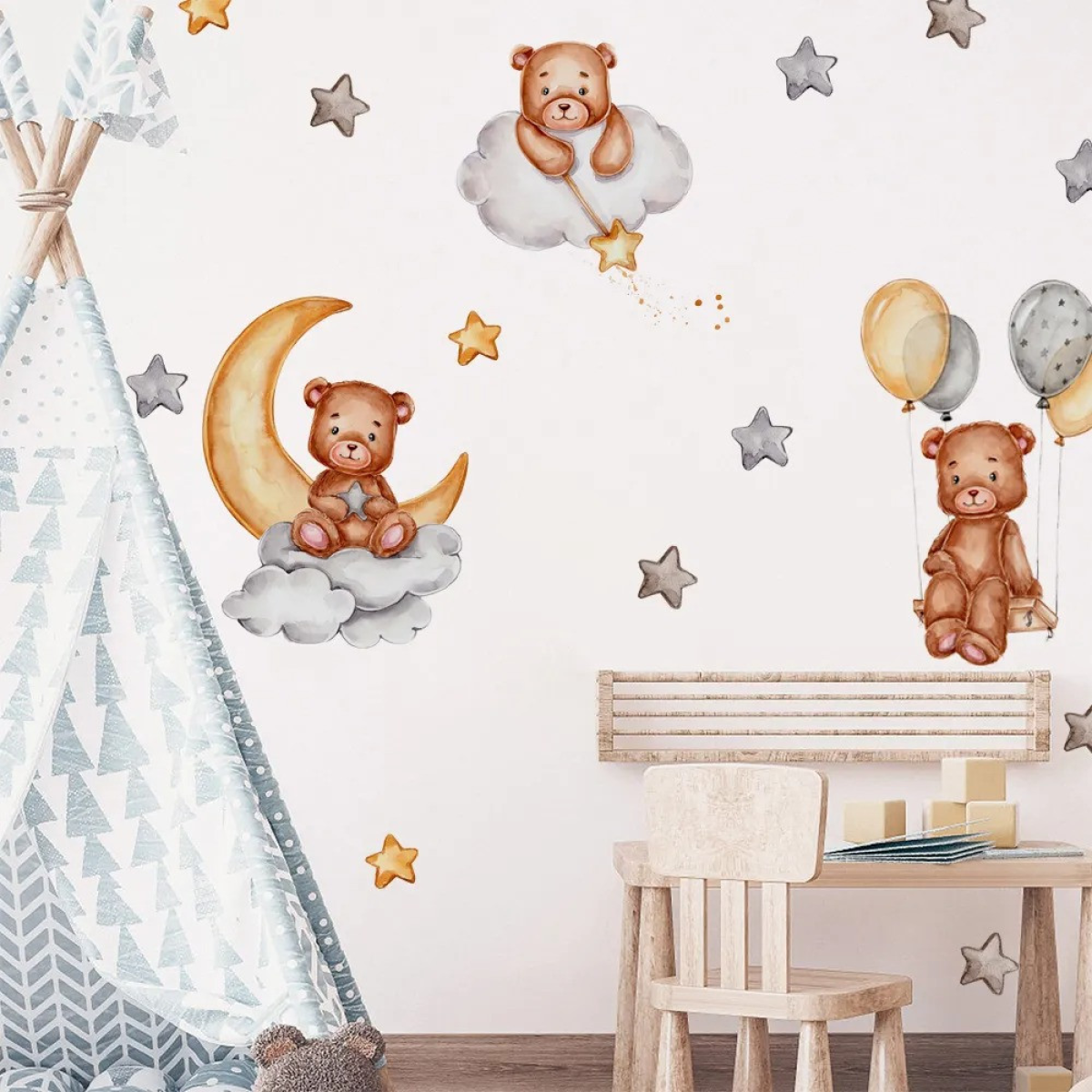 Ведмежата в зоряному небі: чарівна прикраса для дитячої Вінілові наклейки «Ведмежата» створюють атмосферу казки та затишку в дитячій кімнаті. Цей унікальний набір дає змогу зануритися в чарівний світ зоряного неба, де милі ведмежата грають серед хмар і повітряних кульок. Кожен елемент виконаний з любов“ю до деталей, що робить композицію неймовірно ніжною і привабливою для малюків. Композиція включає трьох чарівних ведмежат: двоє ширяють на хмарах, оточені м“якими зірками, а третій тримається за повітряні кулі, піднімаючись до небес. Такий декор подарує дитині радість і надихатиме на фантазії про чудові пригоди. Приємні кольори та вишуканий дизайн прикрасять будь-яку стіну, надаючи кімнаті особливого тепла та індивідуальності. Наліпки виконані з високоякісного ПВХ, який забезпечує довговічність і простоту використання. Набір розміром 30х90 см дає змогу легко створити свою унікальну композицію, комбінуючи елементи на свій смак. Ці наклейки стануть ідеальним рішенням для декорування дитячої кімнати хлопчика або дівчинки. Особливості товару: Три милих ведмедика в зоряному небі. Елементи: хмари, зірки, повітряні кулі. Матеріал: високоякісний ПВХ, розмір 30х90 см. Простота наклеювання і зняття без пошкодження поверхні.