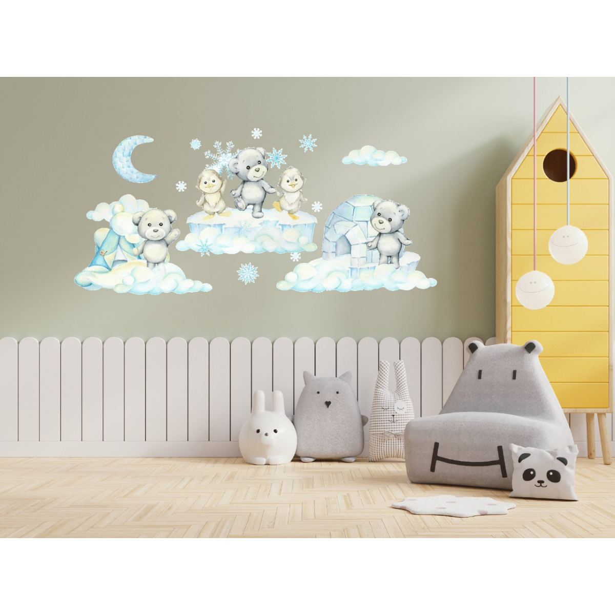 Вінілові наклейки «Ведмежата і пінгвіни» - це ідеальне декоративне рішення для створення казкової атмосфери в дитячій кімнаті. На композиції зображені три милі ведмежата і пінгвіни, що ширяють на крижинах серед небесного пейзажу. Одне з ведмежат весело танцює з пінгвінами на крижині, в той час як два інших з цікавістю спостерігають за тим, що відбувається поруч зі своїми затишними будиночками.