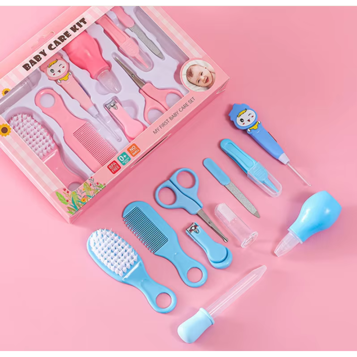 Склад набору Дозатор ліків, Полірувальні пилочки, Кусачки для нігтів, Назальний аспіратор, Гребінець, Прорізувач, Щітка для волосся, Зубна щітка, Пінцет, Ножички