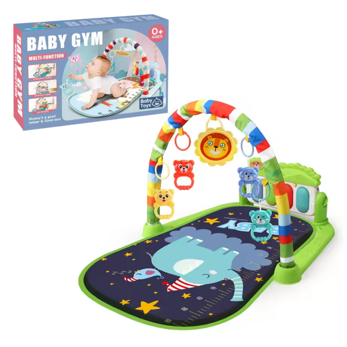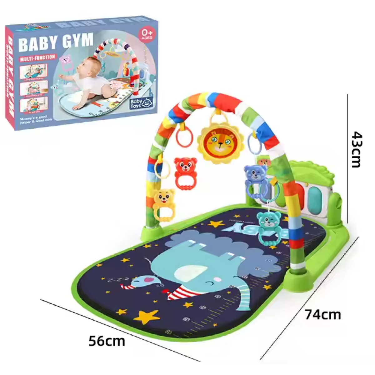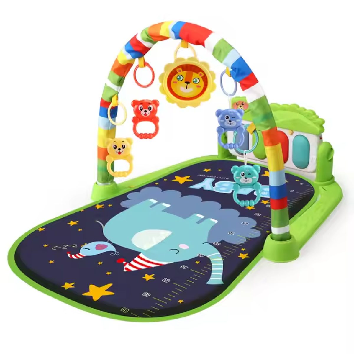 Ігровий дитячий килимок з музичним піаніно, підвісними іграшками, шкалою зросту, принт зелений слон