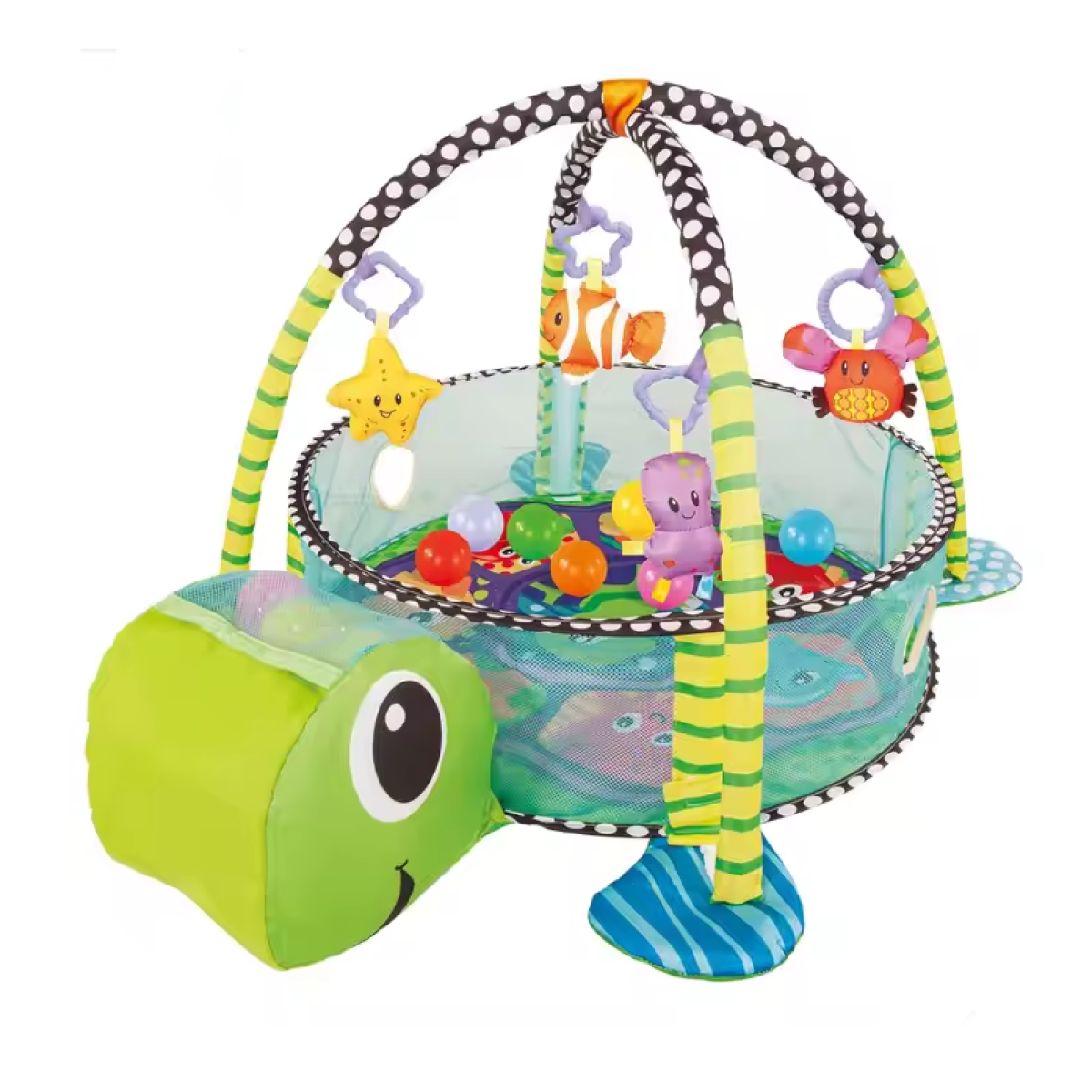 Дитячий розвивальний килимок-манеж з дугами та кульками, модель черепаха - чудовий вибір для ігор і розвитку малюків від 0 до 24 місяців. Його можна використовувати як м“який ігровий килимок з іграшками або трансформувати в компактний манеж з бортиками-сіткою і яскравими кульками. Килимок оснащений двома перехресними дугами і 4 знімними підвісними іграшками, які можна використовувати окремо. У «панцирі» черепахи зручно зберігаються 30 кульок, що ідеально підходять для ігор у міні-манежі. Яскраві зображення сприяють зоровому сприйняттю, а іграшки розвивають хапальні рефлекси та моторику. М“яка основа з бавовняним наповненням забезпечує комфорт, а сітка-борт підвищує безпеку. Особливості: Легка збірка Простота догляду Безпечні матеріали Ідеально для сенсорного розвитку Характеристики: Вік: від 0 до 24 місяців Матеріал: безпечний пластик, м“яка основа з бавовняним наповненням Комплектація: 4 підвісні іграшки, 30 кульок Розмір килимка: 95×70×50 см Упаковка: 42×32×14 см Модель: черепаха