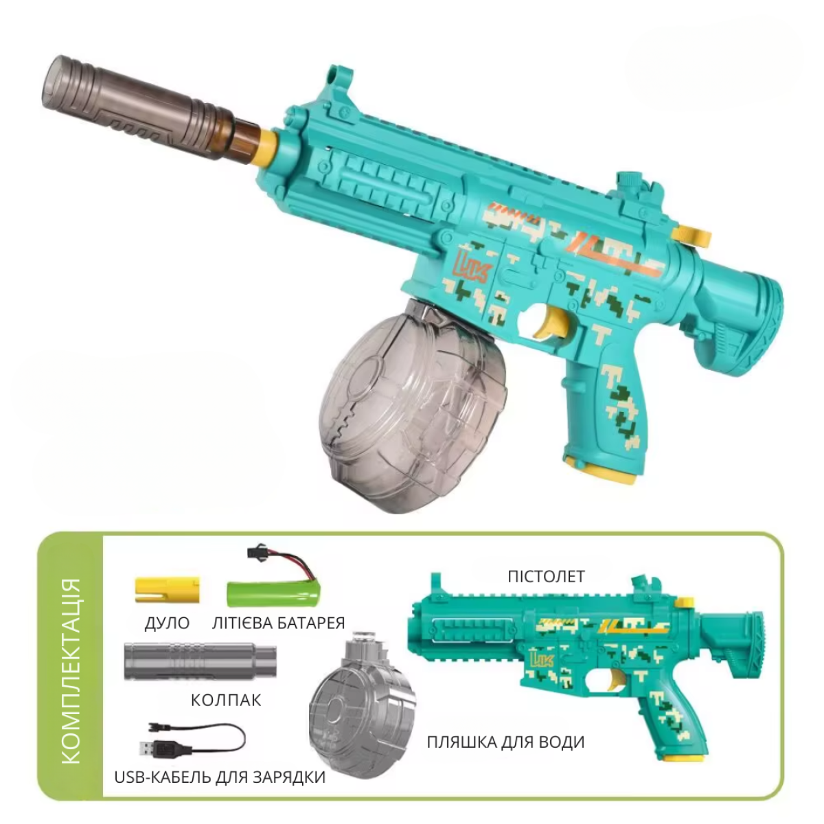 Електричний водяний пістолет М416 - чудова іграшка для активних ігор на свіжому повітрі! Корпус виконано з ABS-пластику, що робить його стійким до ударів і довговічним. Зручний дизайн забезпечує комфортне утримання, а надійна ізоляція захищає акумулятор і електроніку від вологи. Вбудований акумулятор підтримує до 50 хвилин роботи без підзарядки. Повний час заряджання становить 2 години через USB-кабель. Дальність стрільби сягає 8-10 метрів, а резервуар для води об“ємом 400 мл дає змогу вести тривалі водні битви без частих дозаправок. Електричний водяний пістолет М416 стане чудовим подарунком для дітей і дорослих, забезпечуючи масу веселощів і яскравих емоцій! Характеристики: Матеріал: міцний ABS-пластик Час роботи: до 50хв Час зарядки: 2год Дальність стрільби: 8-10м Розмір: 44x18x4см Комплектація: водяний пістолет М416, дуло, глушник, батарею, USB-кабель для заряджання та резервуар для води 450мл Колір: зелений