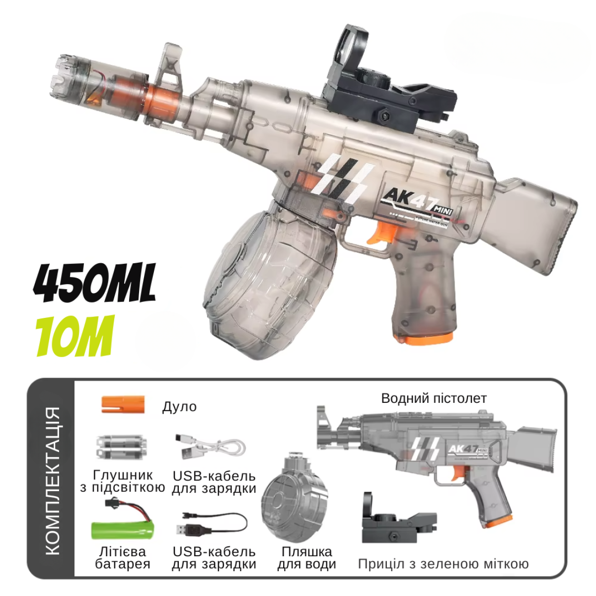 Водний електричний пістолет для дітей, бластер на акумуляторі, водний автомат АК47, іграшковий, сірий