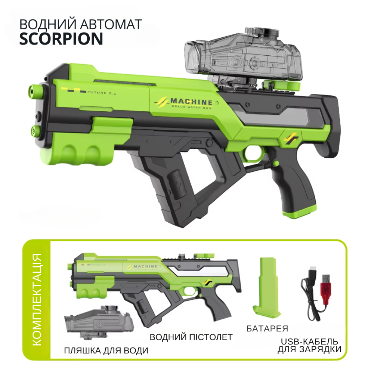 Водний пістолет для дітей, електричний водний автомат Скорпіон з автоматичним закачуванням води, зелений