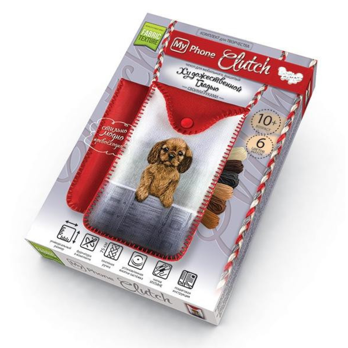 У комплекті: 1 схема-заготівка з малюнком вишивки з кнопкою, 1 полотно для зворотного боку чохла з кнопкою, комплект різнобарвних ниток муліні, 1 голка, інструкція.