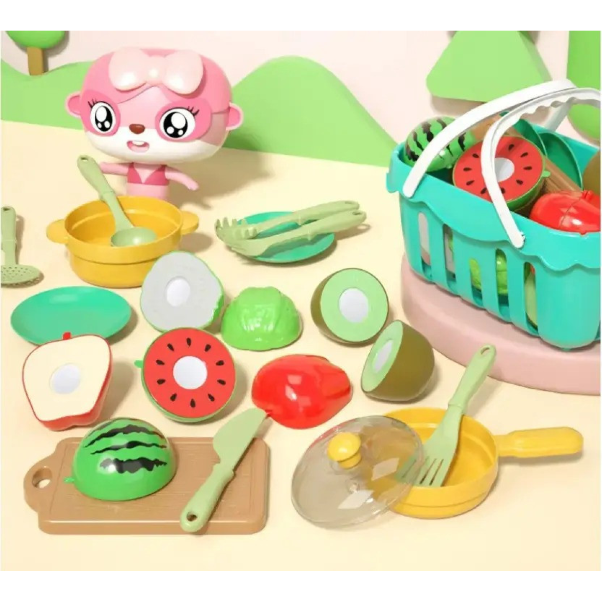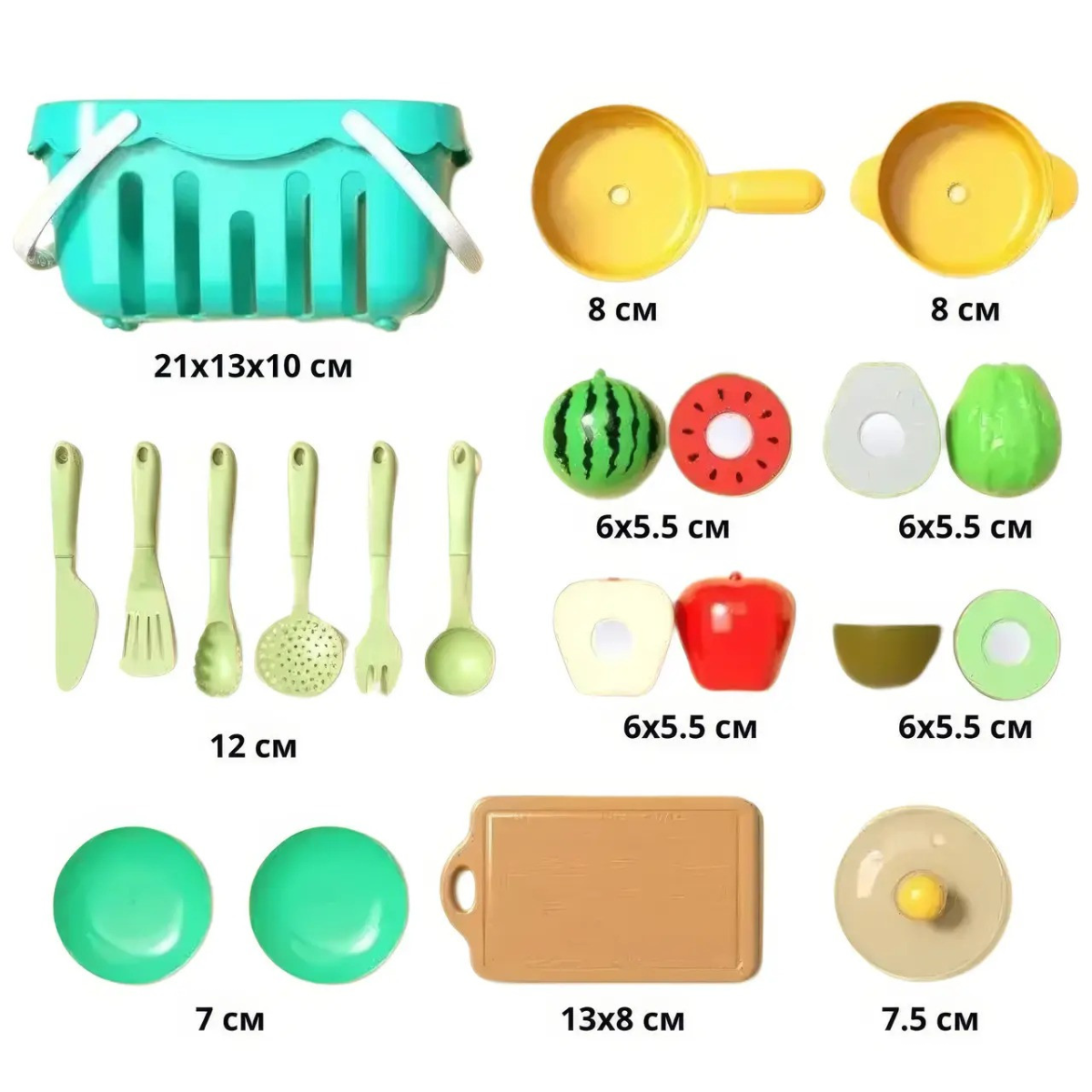 Цей чудовий дитячий кухонний набір містить 17 яскравих і безпечних пластикових предметів, які перетворять гру на справжню кухонну або торговельну крамницю! Серед предметів - кошик з авокадо, ківі, кавуном і яблуком, а також повний комплект кухонного приладдя: дошка для нарізання, столові прилади, сковорідка, каструля з кришкою і дві тарілки. Такий набір ідеально підходить для рольових ігор, допомагаючи дітям розвивати фантазію і соціальні навички. Іграшки виконані з міцного та екологічно чистого пластику, безпечного для дітей. Завдяки якісному матеріалу і продуманим деталям, набір витримує активні дитячі ігри, не втрачаючи своїх яскравих кольорів і форми. Компактний кошик дає змогу легко збирати та зберігати іграшки, що привчає дітей до порядку. Особливості набору: 17 предметів для захопливої гри. Яскраві та реалістичні фрукти: авокадо 1шт, ківі 1 шт, кавун 1 шт, яблуко 1шт. Додаткові аксесуари: столові прилади 6 шт, дошка для нарізки 1шт, кошик 1шт, сковорода 1шт, каструля з кришкою і дві тарілки. Матеріал: безпечний пластик без гострих країв. Розвиток дрібної моторики, фантазії та пізнавальних здібностей.