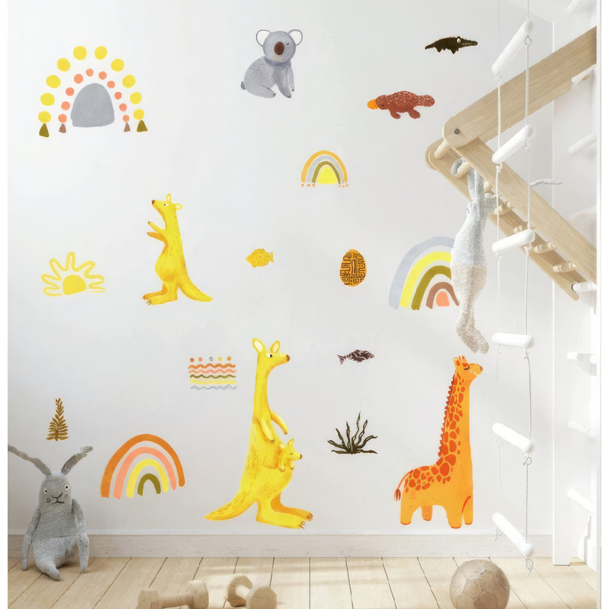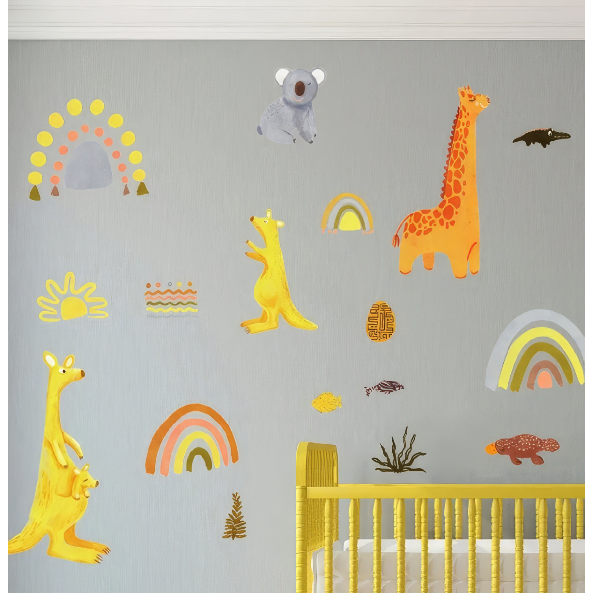 Зображення жирафа, двох кенгуру, коали, крокодила, качкодзьоба, веселки і сонця.