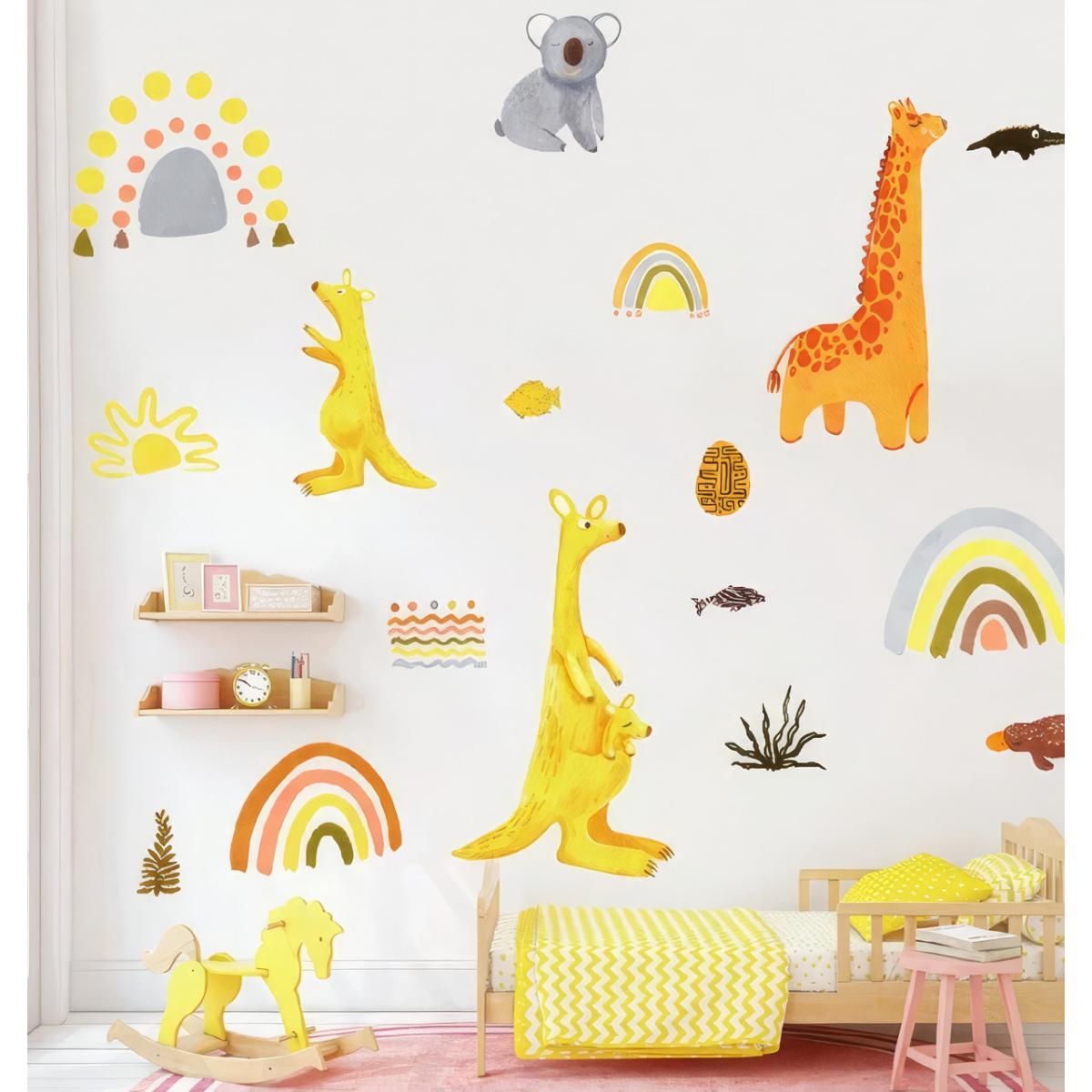 Набір вінілових наклейок «Зоопарк» перетворить будь-яку дитячу кімнату на справжній куточок пригод. Барвисті зображення жирафа, двох кенгуру, коали, крокодила і качкодзьоба наповнять простір атмосферою дикої природи і радості. Наліпки веселки та сонця, що доповнюють композицію, додадуть інтер“єру теплої та життєрадісної атмосфери.