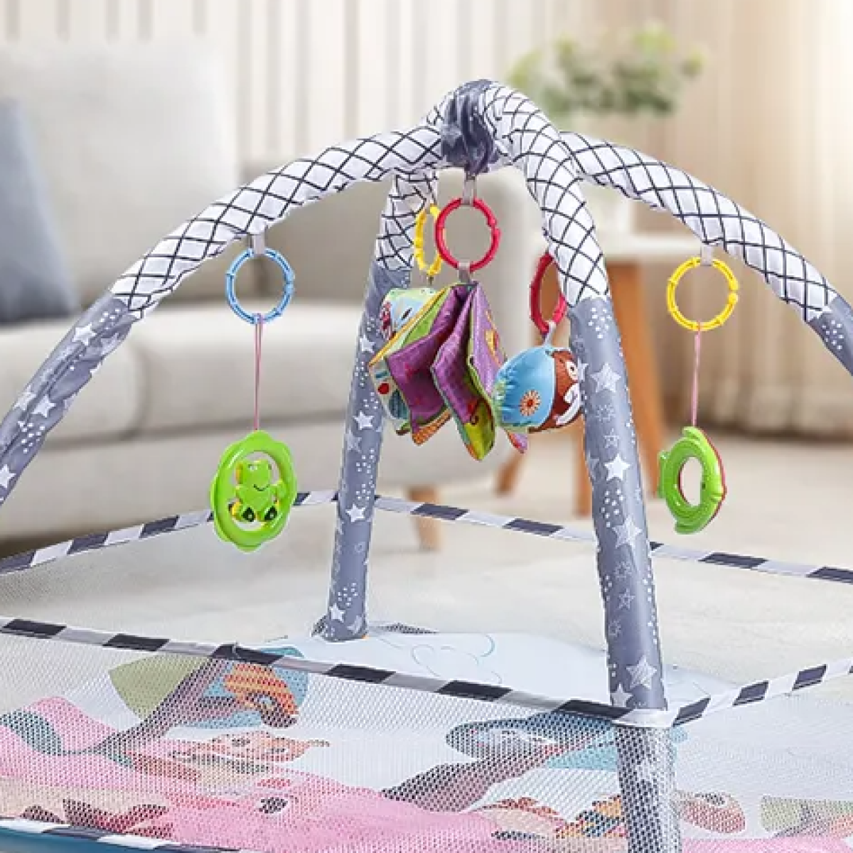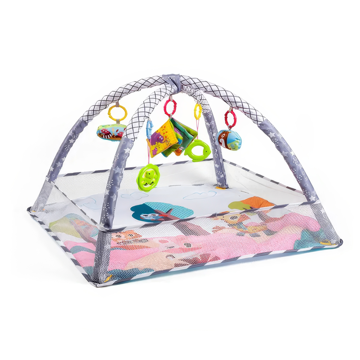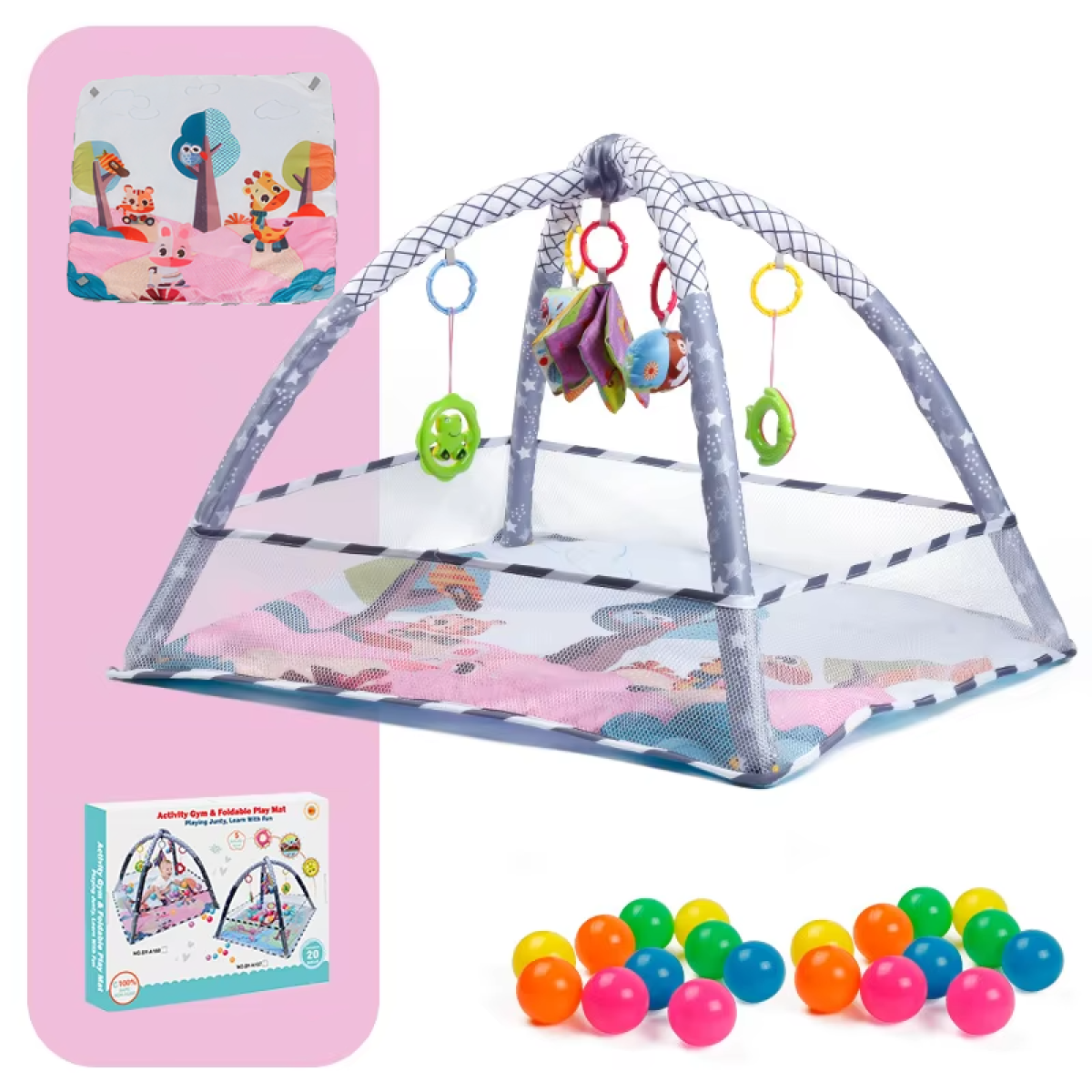 Розвиваючий килимок-манеж з підвісними іграшками, манеж для дітей з огорожею, 80x80x50см, рожевий