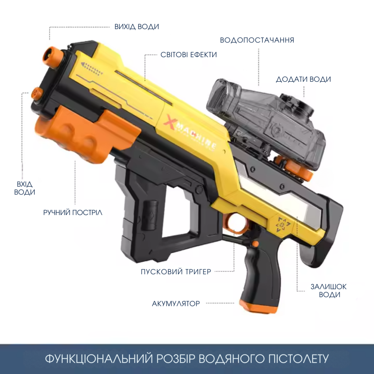 Відкрийте новий рівень водних битв з автоматичним електричним водяним автоматом. Цей потужний бластер оснащений інноваційною системою водопостачання та світловими ефектами, що робить гру ще більш захопливою. Головні особливості: Автоматична подача води - наповнення резервуара відбувається одним рухом, без необхідності ручного перезарядження Великий бак 800 мл - забезпечує тривалі битви без частого доливання води Дальність стрільби 10м - потужний напір води дає змогу вразити противника з великої відстані Ручний і автоматичний режим стрільби - вибирайте зручний варіант для динамічних ігор Світлові ефекти - під час пострілу активується підсвічування, створюючи ефект бойової зброї USB-зарядка й акумулятор - забезпечує до 50 хвилин автономної гри без підзарядки Іграшка виготовлена з міцного ABS-пластику, що гарантує безпеку і довговічність. Ергономічний дизайн зі зручною рукояткою робить пістолет комфортним у використанні як для дітей, так і для дорослих. Характеристики: Матеріал: ABS-пластик Розмір: 50×21×5см Об“єм бака: 800 мл Дальність стрільби: 10 метрів Живлення: акумулятор (зарядка через USB) Час роботи: до 50 хвилин Комплектація: водяний пістолет, акумулятор, USB-кабель для зарядки, резервуар для води