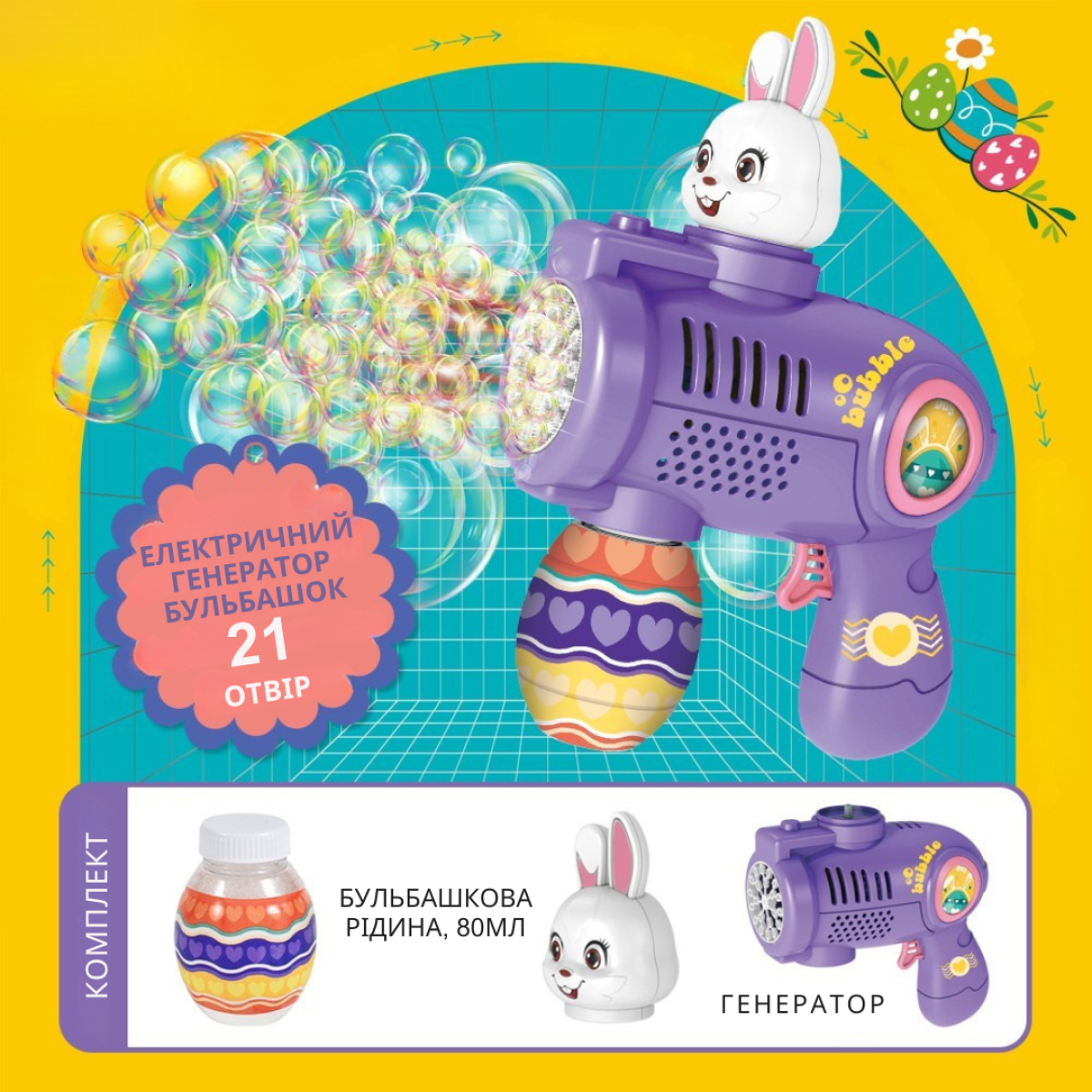 Генератор мильних бульбашок, пістолет з LED-підсвіткою на батарейках для мильних бульбашок для дітей, кролик