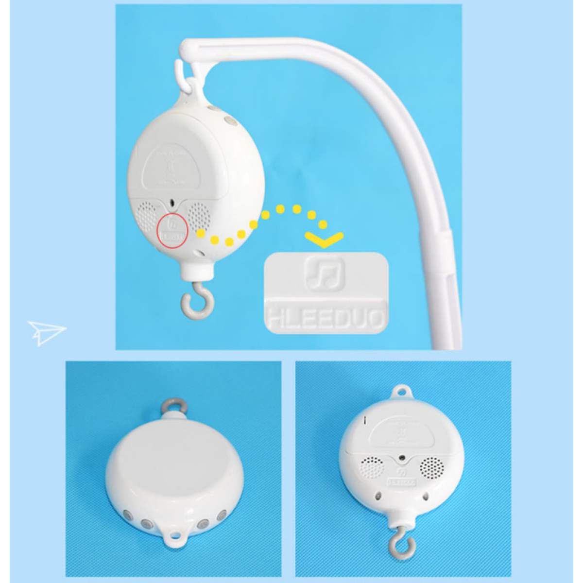 Музика приємна, не гучна. Грає поки Ви САМІ його не вимкнете. Не треба бігати через кожні 3 хвилини та заводити.  Музика грає, каруселька крутиться, малюк спостерігає за іграшками або намагається їх ловити, а у Вас є трохи часу для СЕБЕ!