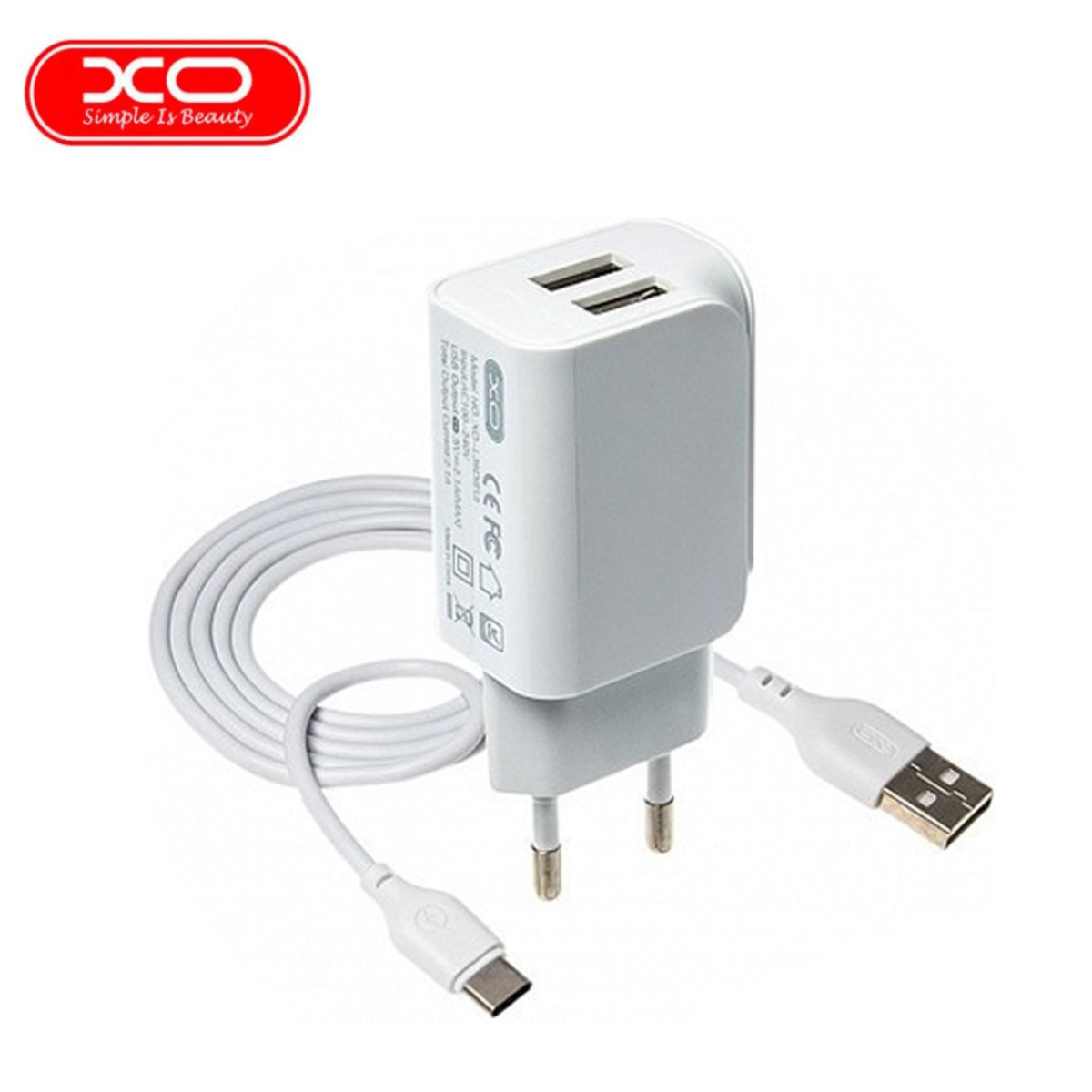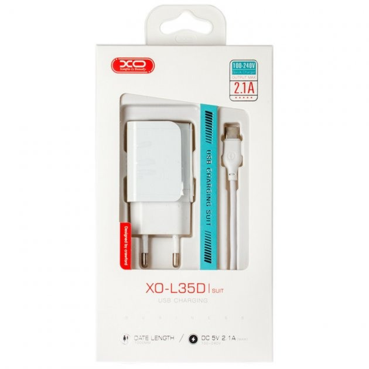 Мережевий зарядний пристрій з кабелем USB - Type-C XO L35D та двома USB портами 2.1A Білий