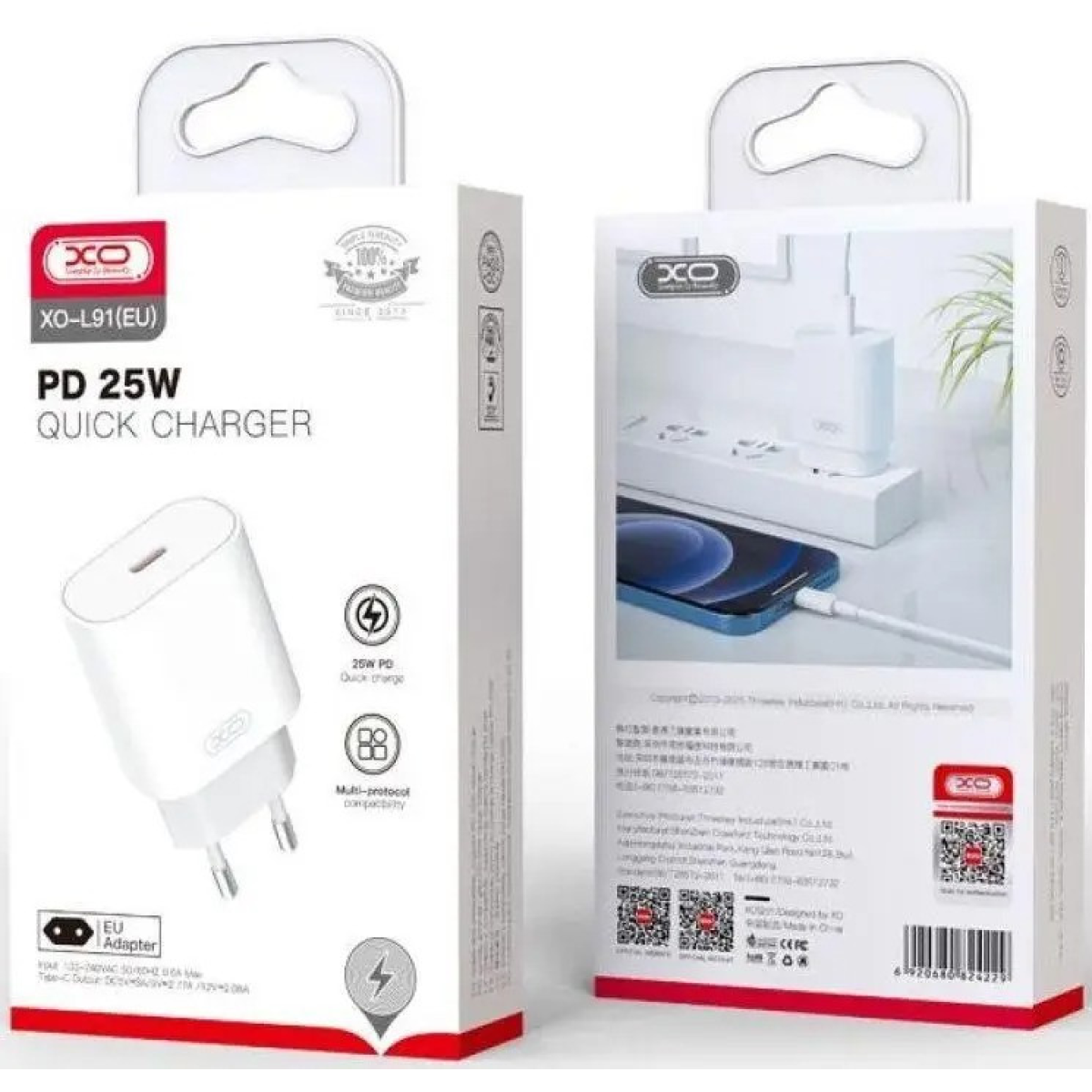Мережевий зарядний пристрій XO L91 PD Білий з роз“ємом Type-C/25W, зарядка для телефону