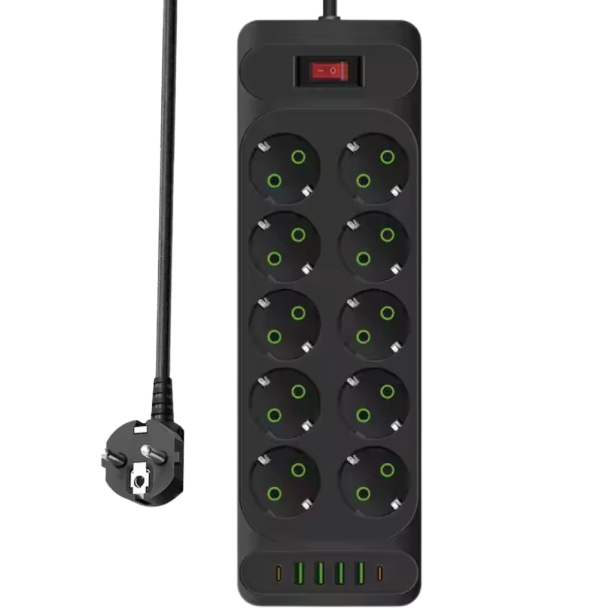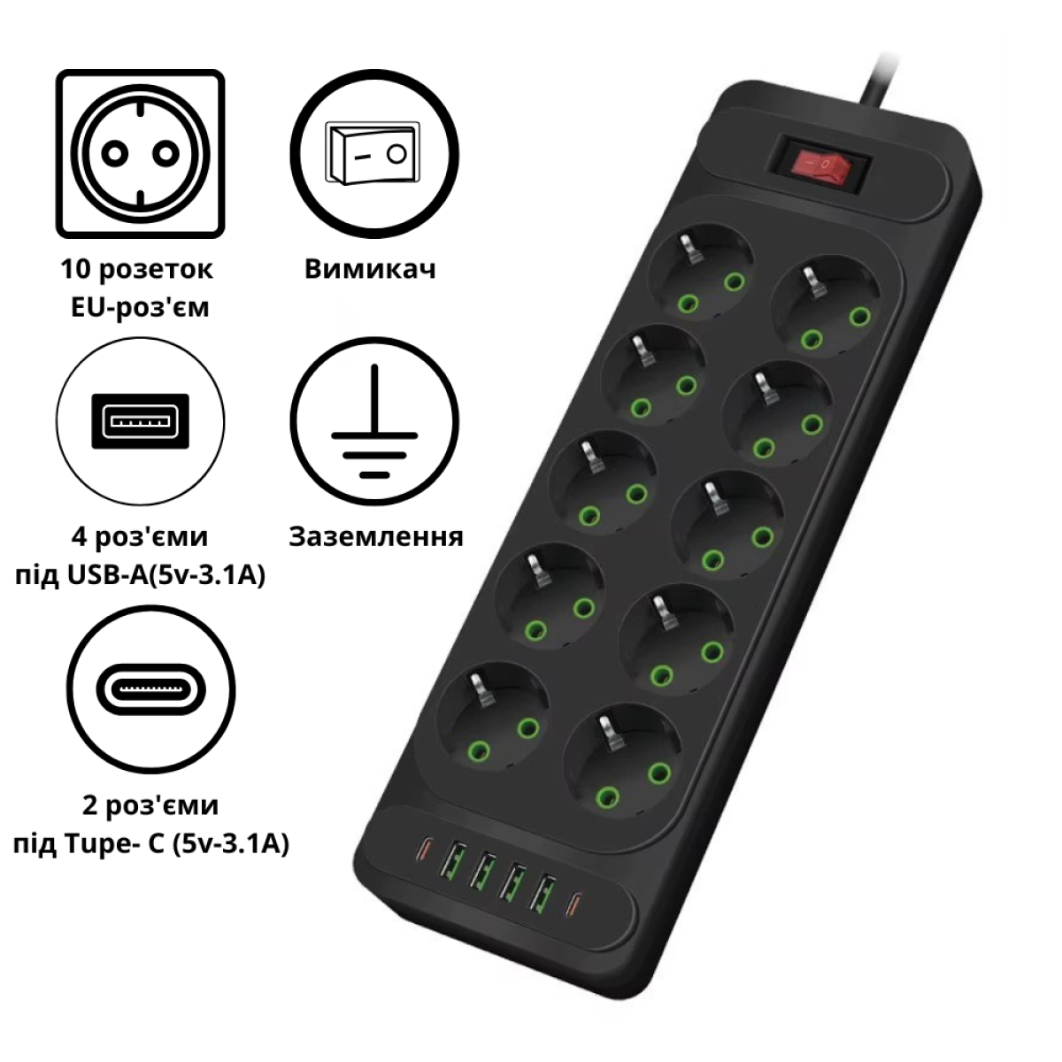 Мережевий фільтр-подовжувач 2 м з 10 розетками та USB Цей потужний мережевий фільтр забезпечить надійне та безпечне підключення відразу кількох пристроїв. Оснащений 10 євро-розетками із заземленням, а також 4 USB-A і 2 Type-C портами, що дозволяє заряджати гаджети без використання адаптерів. Завдяки максимальній потужності 3000 Вт і міцному корпусу з вогнестійкого пластику (PC), пристрій витримує високі навантаження та захищає вашу техніку. Фільтр-подовжувач підтримує напругу 100V-250V і розрахований на максимальний струм 10A. Зручний кнопковий вимикач дозволяє легко вимикати живлення всіх підключених пристроїв, а довжина кабелю 2 м забезпечує гнучкість у розміщенні. Стильний чорний колір робить його універсальним рішенням для дому, офісу та робочих просторів. Особливості: 10 євро-розеток із заземленням 4 USB-A та 2 Type-C порти (вихід USB 5V-3.1A) Витримує потужність до 3000 Вт Корпус із вогнестійкого пластику Довжина кабелю 2 м, EU-вилка Кнопковий вимикач для зручності використання