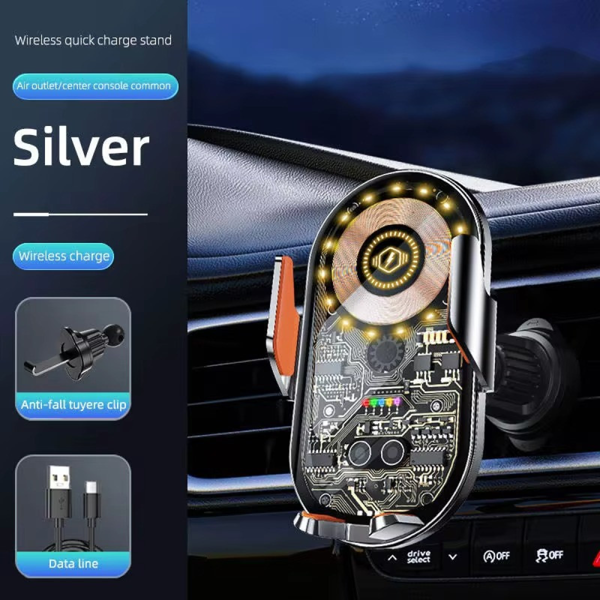 Автотримач JC1013 вирізняється своїм стильним сріблястим кольором і прозорим стилем, який надає йому сучасного та преміального вигляду. Виготовлений з алюмінію, силікону та ABS-пластику, цей тримач поєднує міцність та естетичну привабливість. Компактні розміри 11 х 7 х 5 см і маса 195 грамів роблять його зручним і елегантним аксесуаром для вашого автомобіля.