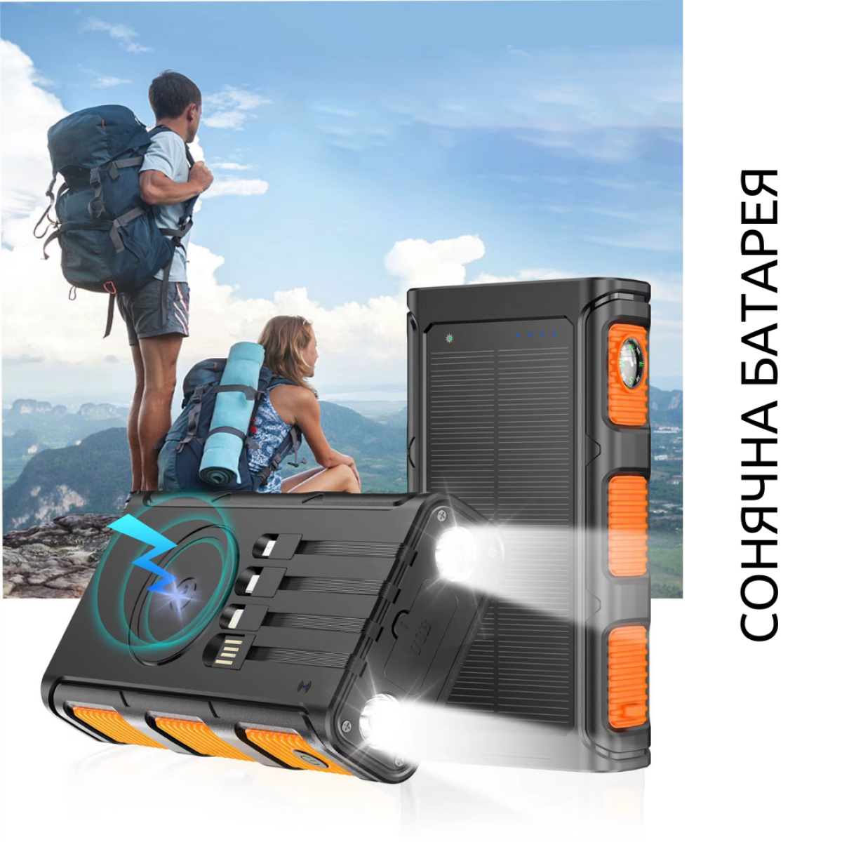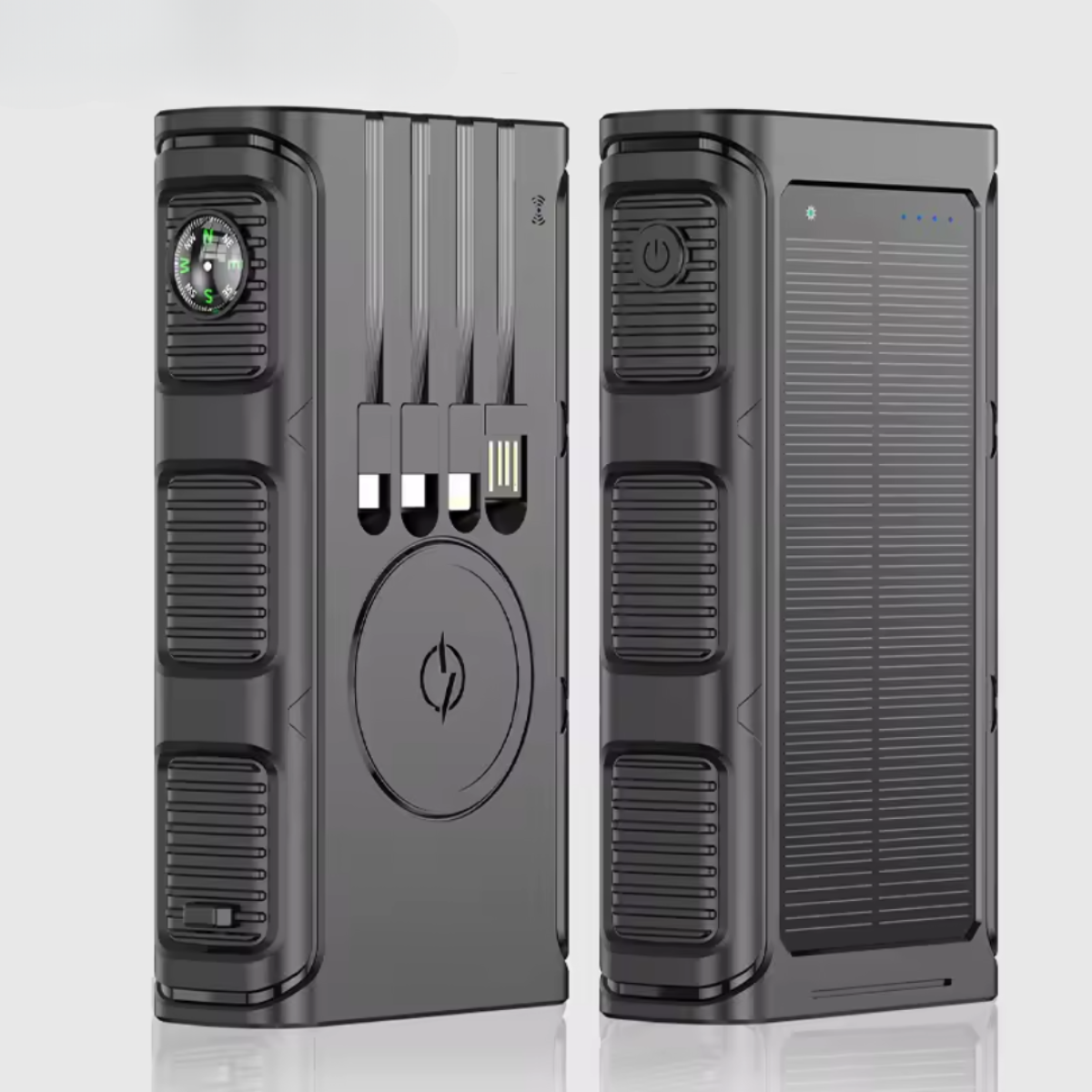 Портативний зовнішній акумулятор на сонячній батареї 20000mAh з бездротовою зарядкою, LED-ліхтарем, 4 вбудованими кабелями та компасом - це ідеальне рішення для активного відпочинку, походів та подорожей. Завдяки вбудованій сонячній панелі з монокристалічного кремнію потужністю 1.8W (5.5V/285mA), він здатний заряджатися навіть далеко від джерел електроенергії. Модель підтримує швидку зарядку за протоколами 5V/3A через Type-C та USB, забезпечуючи миттєву зарядку ваших пристроїв у будь-яких умовах. Головна перевага – можливість зарядки до 6 пристроїв одночасно: 4 вбудовані кабелі (Type-C, Micro USB, Lightning, USB), 2 вихідні порти USB та бездротова зарядка потужністю 5W дозволяють підключати сучасні смартфони, планшети, навушники та інші гаджети. Пристрій також оснащений потужним LED-ліхтарем, компасом та сонячною панеллю, що робить його особливо корисним у походах та екстремальних умовах.