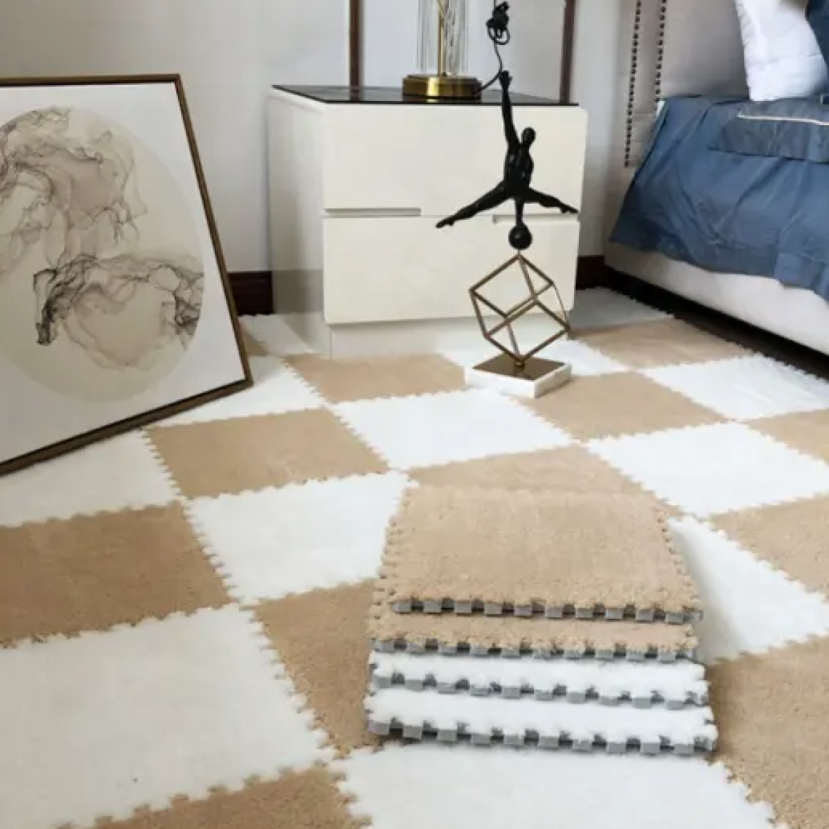 Килимок-пазл плюшевий, термокилимок, мат дитячий теплий 90*120см, 12 пазлів, 2 кольори бежевий/білий