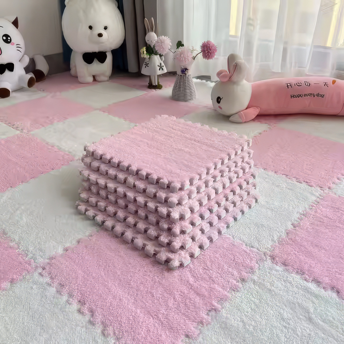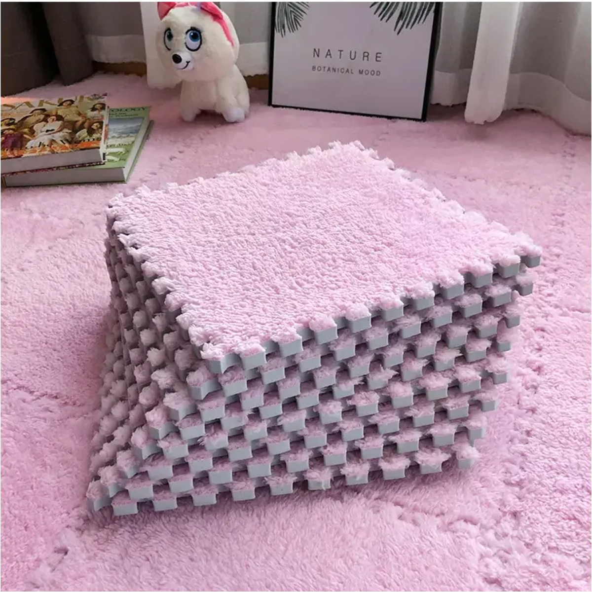 Килимок-пазл із плюшевим покриттям - це практичне рішення для створення м“якої, теплої та безпечної підлоги. Набір складається з 20 модульних плиток розміром 30x30см, які легко з“єднуються, утворюючи поверхню розміром 120x150см. Замкові з“єднання дають змогу легко зібрати килимок потрібної форми, додаючи комфорту та стилю у ваш дім. М“яке плюшеве покриття забезпечує тепло і приємні тактильні відчуття, що робить килимок ідеальним для дитячих кімнат, ігрових зон і місць відпочинку. Основа з EVA-піни гарантує гнучкість, амортизацію та теплоізоляцію, створюючи затишок навіть на холодній підлозі. Цей килимок універсальне рішення для дому. Він стійкий до зношування, легко миється і має текстуровану антиковзаючу основу для додаткової безпеки. Характеристики: Розмір килимка в зборі: 120x150см Кількість плиток у наборі: 20шт Розмір однієї плитки: 30x30см Висота: 1см основа + 0.6см плюшевий шар Матеріал основи: EVA-піна Матеріал покриття: плюшевий текстиль Підходить для створення індивідуального дизайну підлоги (можна замовити потрібний колір з асортименту)