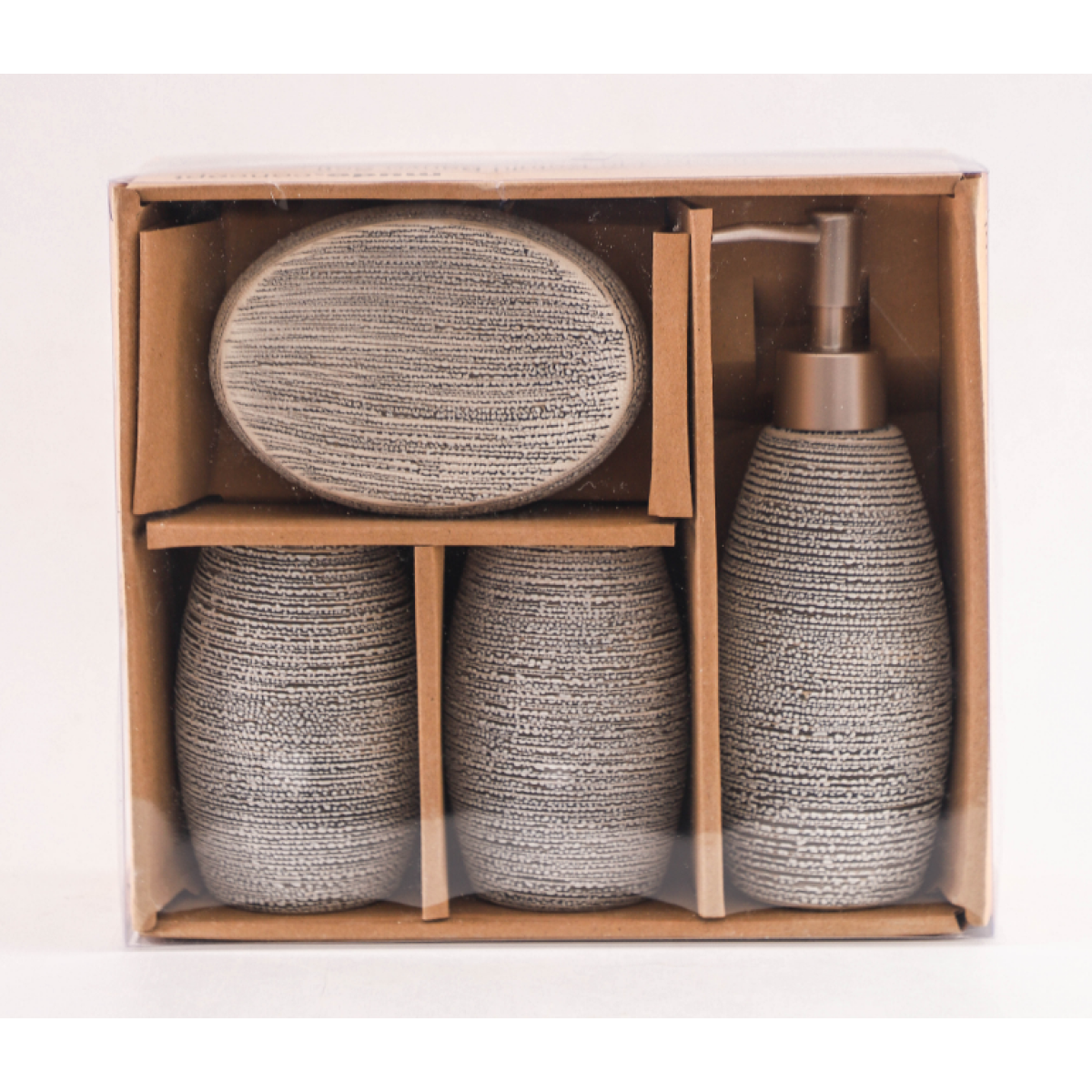 • Дозатор, мильниця та стакани, Набір кераміних аксесуарів для ванної кімнати, Бежевий (текстура)