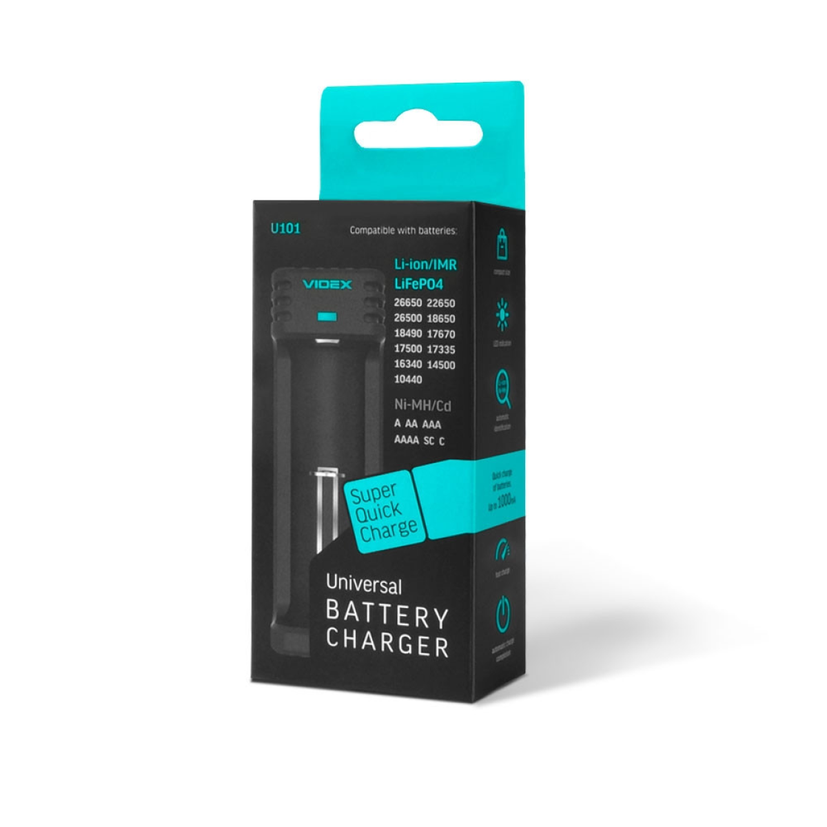 Автоматичний зарядний пристрій Videx VCH-U101 дає змогу заряджати різні формати акумуляторів — від простих і популярних типорозмірів АА, ААА до Li-ion, починаючи від 10440 до 26650, включно з найпопулярнішим форматом — 18650. Пристрій просто в керуванні — Вам досить вставити акумулятори в гнізда — інше Videx зробить сам.