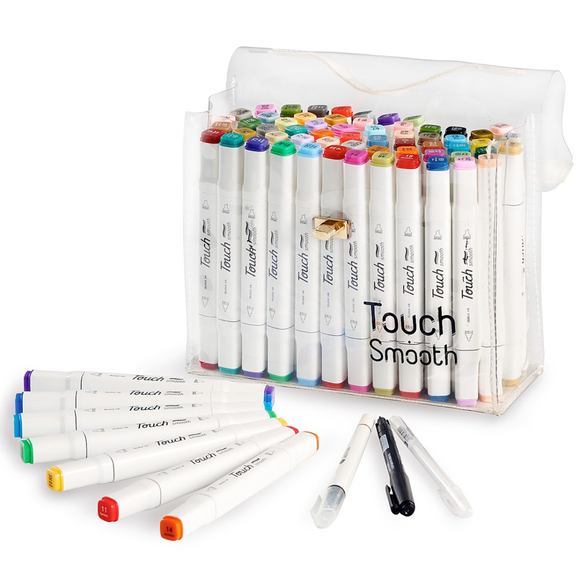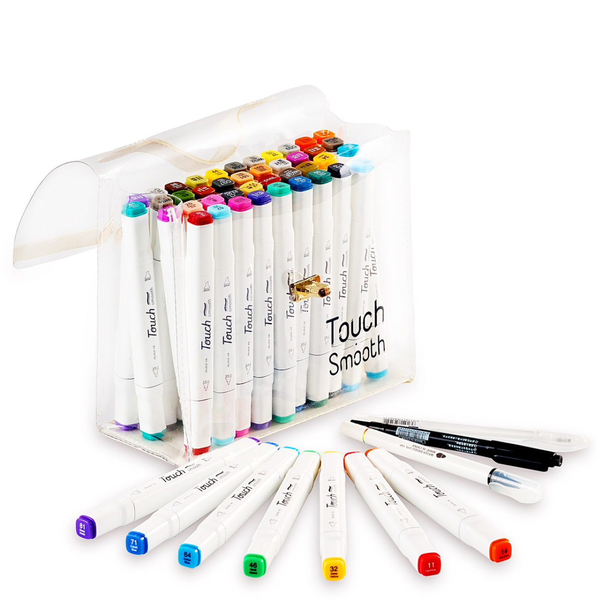 Спиртовые маркеры Touch Smooth для тех, кто увлечен рисованием и каллиграфией, любит создавать комиксы и живописные эскизы. В наборе 48 маркеров разных цветов. Корпус пластиковый, гладкий. Колпачки плотно закрываются. Каждый маркер имеет два наконечника разной формы для разного типа работ. Заостренный наконечник для тонких линий и контуров. Плоский наконечник со скошенным краем для широких штрихов. Для удобства распознавания типа пера концы маркеров окрашены разным цветом. Каждый цвет имеет свой цифровой код, который нанесен на колпачок маркера. Чорнило на спиртовій основі добре вбираються в папір, тому рекомендується використовувати щільні листи або картон. Кольори добре змішуються між собою, плавний перехід відтінків. Хороший вибір відтінків для шкіри людини Довжина маркера 16,8 см.