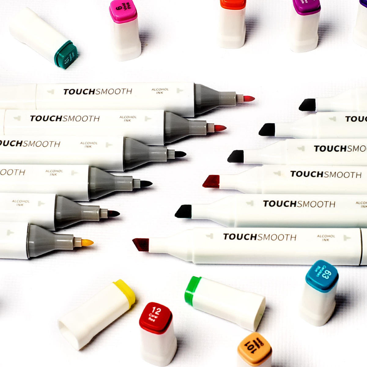 Спиртові маркери Touch для тих, хто захоплений малюванням та каліграфією, любить створювати комікси та мальовничі ескізи. У наборі 168 маркерів різних кольорів. Корпус пластиковий гладкий. Ковпачки щільно закриваються. Кожен маркер має два наконечники різної форми для різних типів робіт. Загострений наконечник для тонких ліній та контурів. Плоский наконечник із скошеним краєм для широких штрихів. Для зручності розпізнавання типу пера кінці маркерів пофарбовані різним кольором. Кожен колір має свій цифровий код, нанесений на ковпачок маркера. Чорнило на спиртовій основі добре вбирається в папір, тому рекомендується використовувати щільні листи або картон. Кольори добре поєднуються між собою, перехід відтінків плавний. Хороший вибір відтінків для шкіри людини Довжина маркеру 16,8 см.