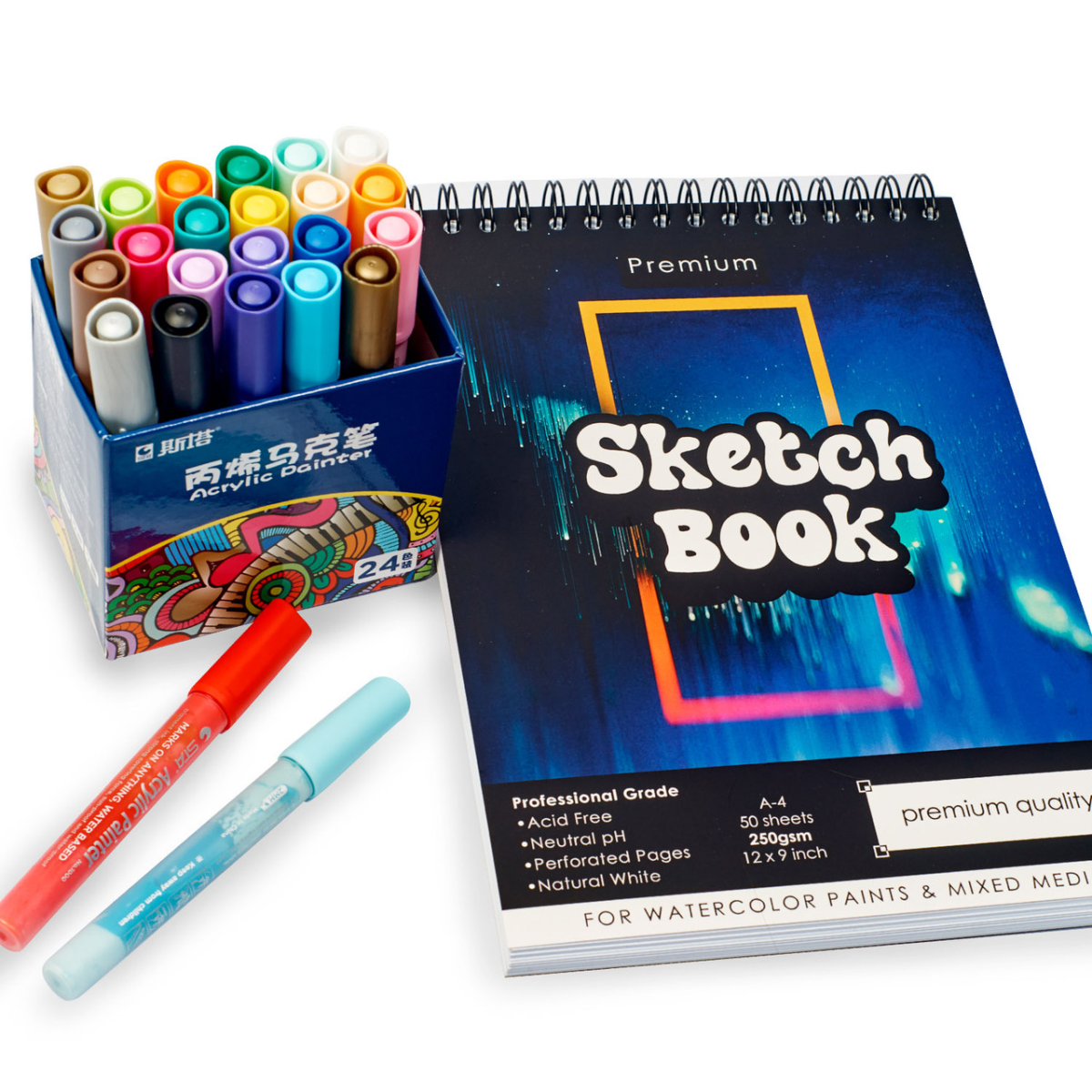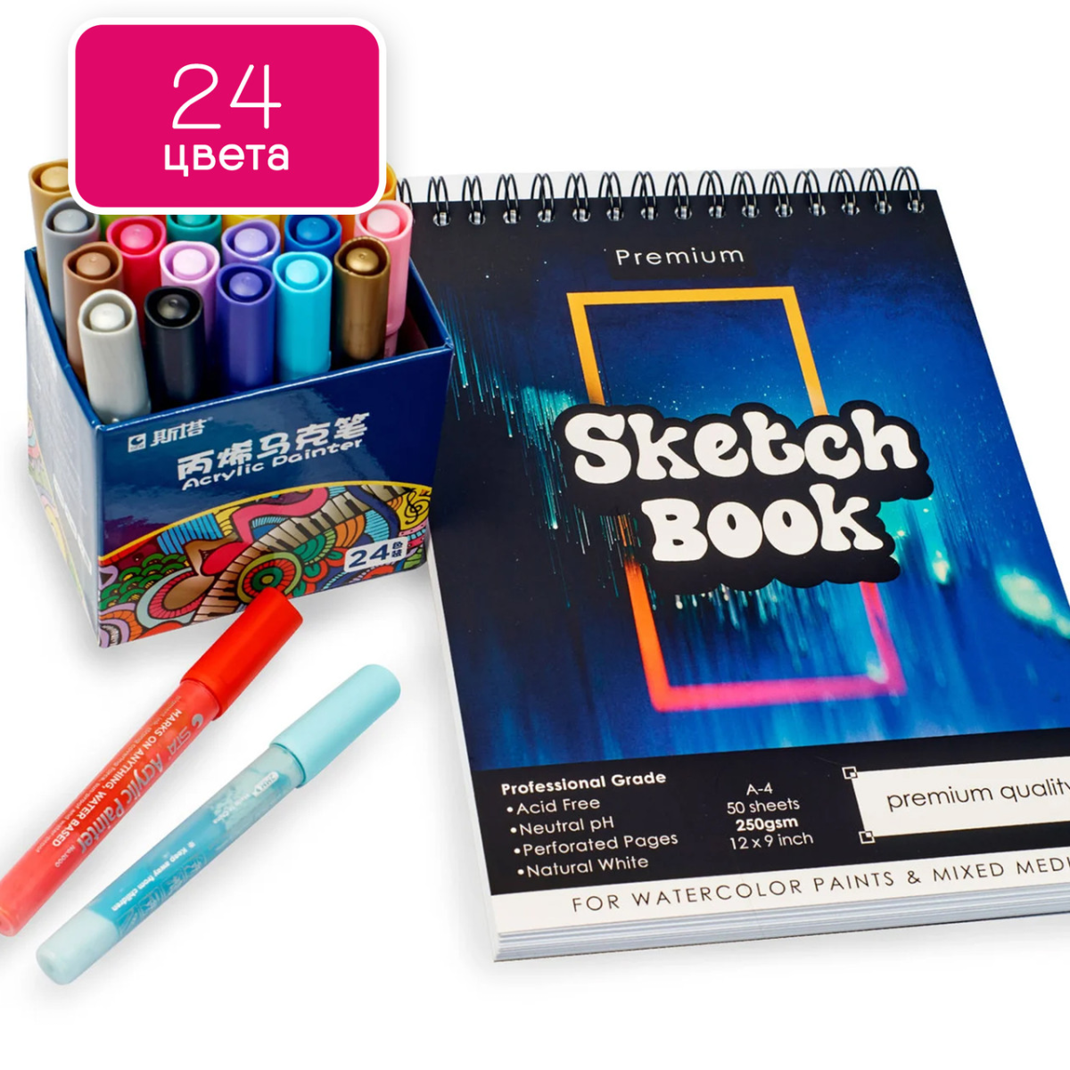 Готовий комплект для малювання, Набір акрилових маркерів 24 кольори + скетчбук для малювання на 50 аркушів А4