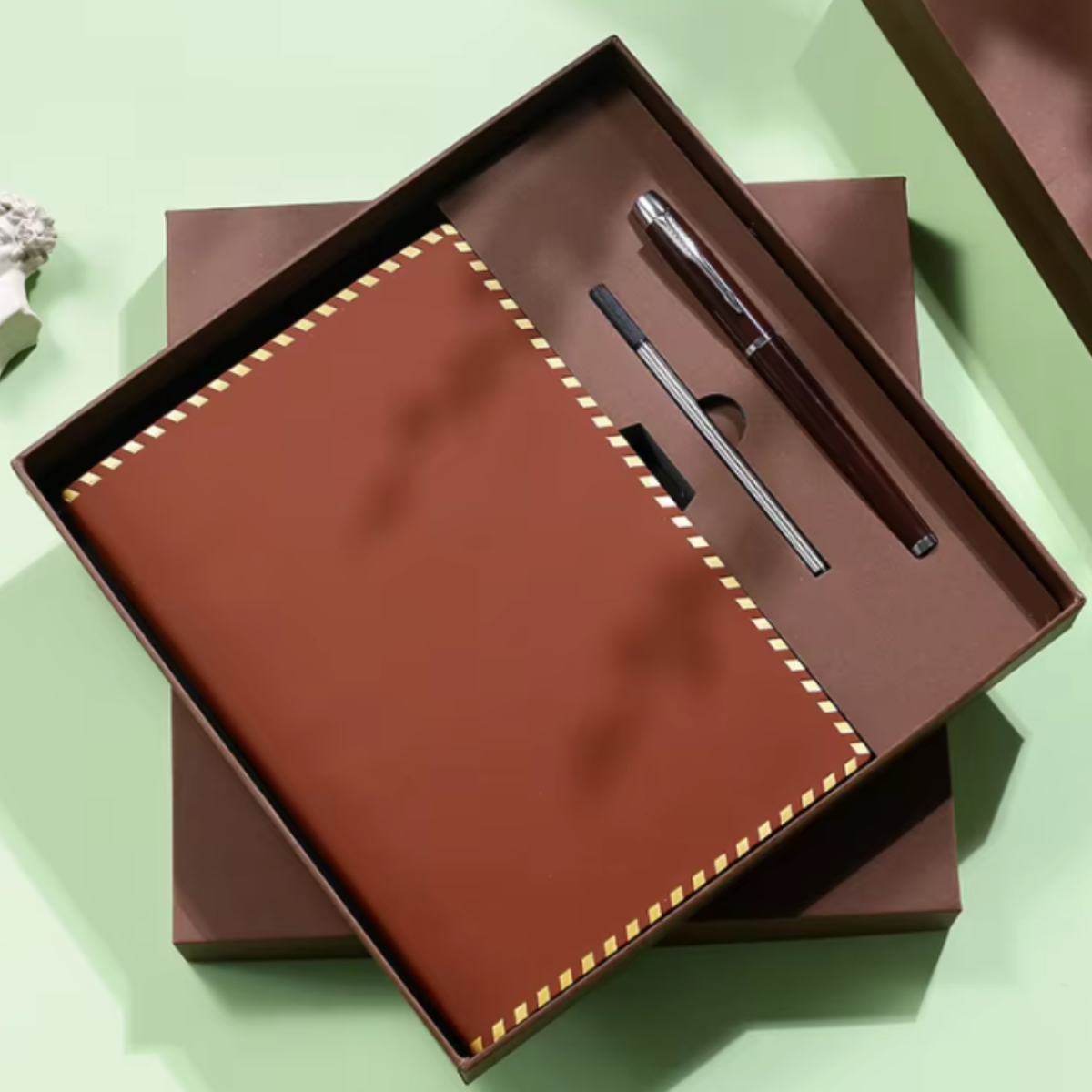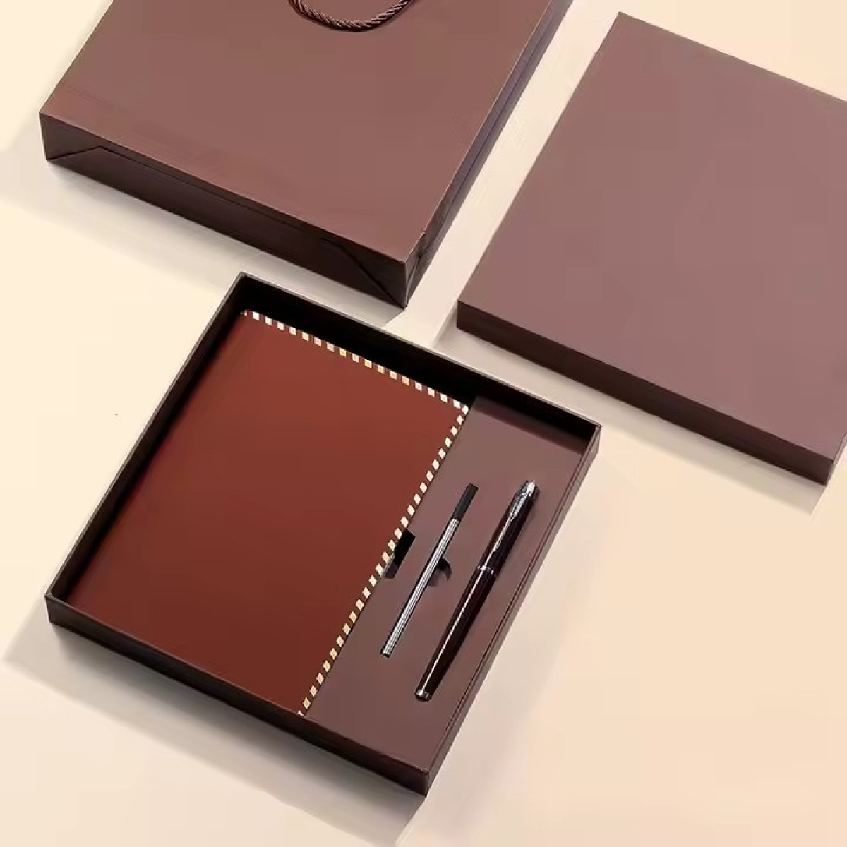 Блокнот А5 на 200 аркушів з ручкою скетчбук з еко-шкіри в подарунковій упаковці, набір 3в1, колір коричневий