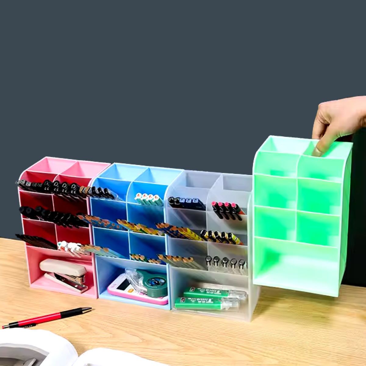 Органайзер настільний багатофункціональний - це компактне і стильне рішення для зберігання ваших речей. Він дає змогу організувати шкільне канцелярське приладдя, інструменти для манікюру, косметику, залишаючи ваш стіл або робочу поверхню чистою та впорядкованою. Органайзер має 9 секції, що забезпечує просте сортування і швидкий доступ до потрібних дрібниць. Завдяки міцному пластику органайзер довговічний і стійкий до зношування. Його стильний дизайн додає естетики в робочий простір і може стати яскравим акцентом вашого столу. Характеристики: Матеріал: пластик Кількість секцій: 9 шт Розмір: 12*9*20 см