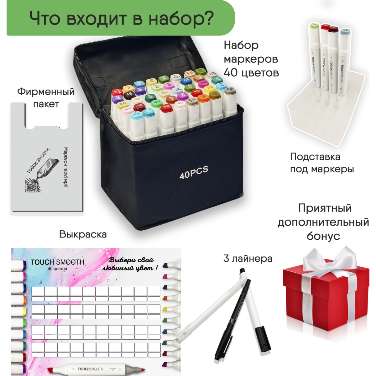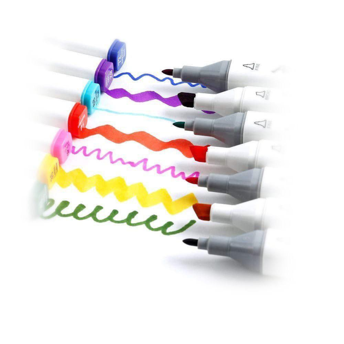 Спиртові маркери Touch для тих, хто захоплюється малюванням і каліграфією, любить створювати комікси і мальовничі ескізи. У наборі 40 маркерів різних кольорів. Корпус пластиковий, гладкий. Ковпачки щільно закриваються. Кожен маркер має два наконечника різної форми для різного типу робіт. Загострений наконечник для тонких ліній і контурів. Плоский наконечник зі скошеним краєм для широких штрихів. Для зручності розпізнавання типу пера кінці маркерів пофарбовані різними кольорами. Кожен колір має свій цифровий код, який нанесений на ковпачок маркера. Чорнило на спиртовій основі добре вбираються в папір, тому рекомендується використовувати щільні листи або картон. Кольори добре змішуються між собою, плавний перехід відтінків. Хороший вибір відтінків для шкіри людини Довжина маркера 16,8 см.