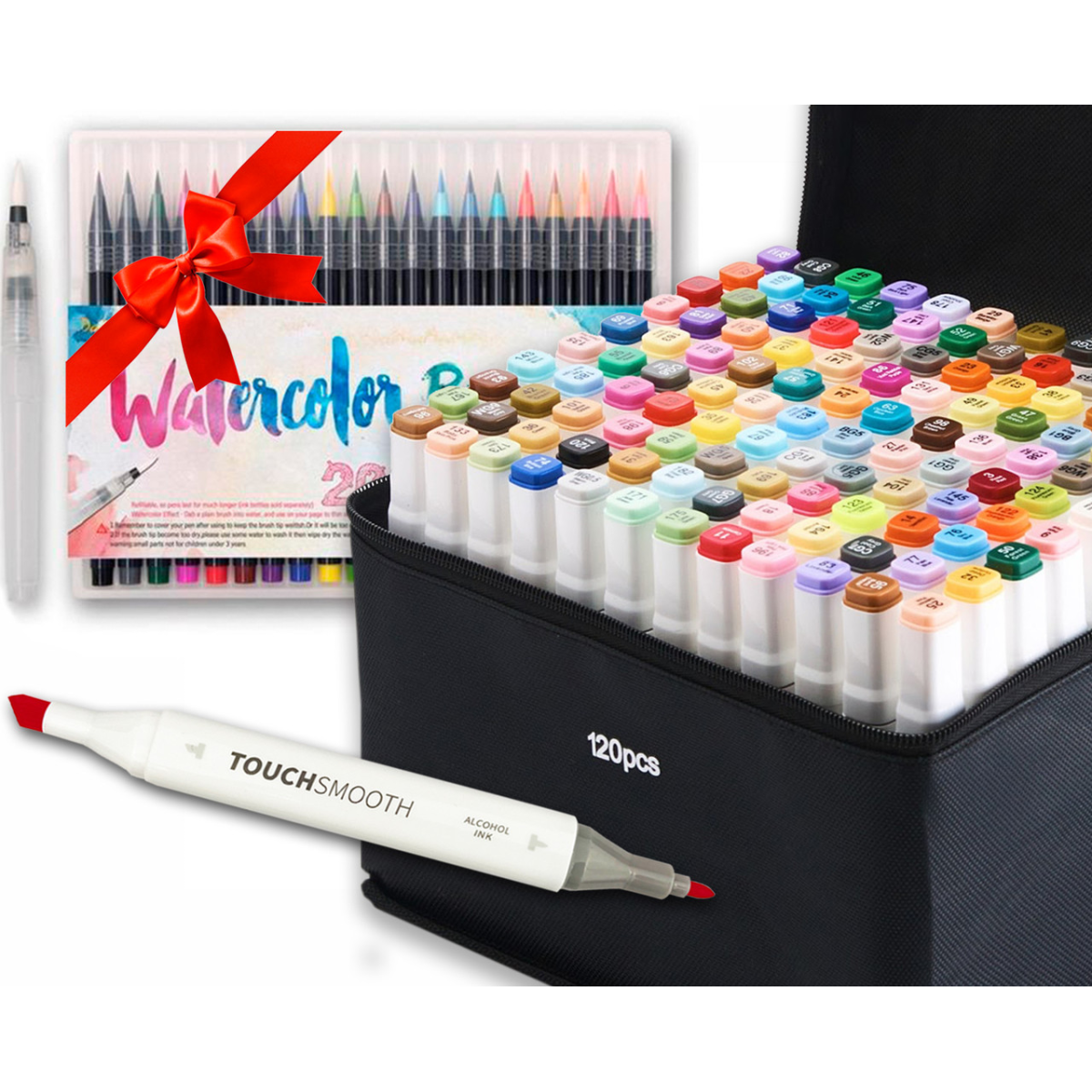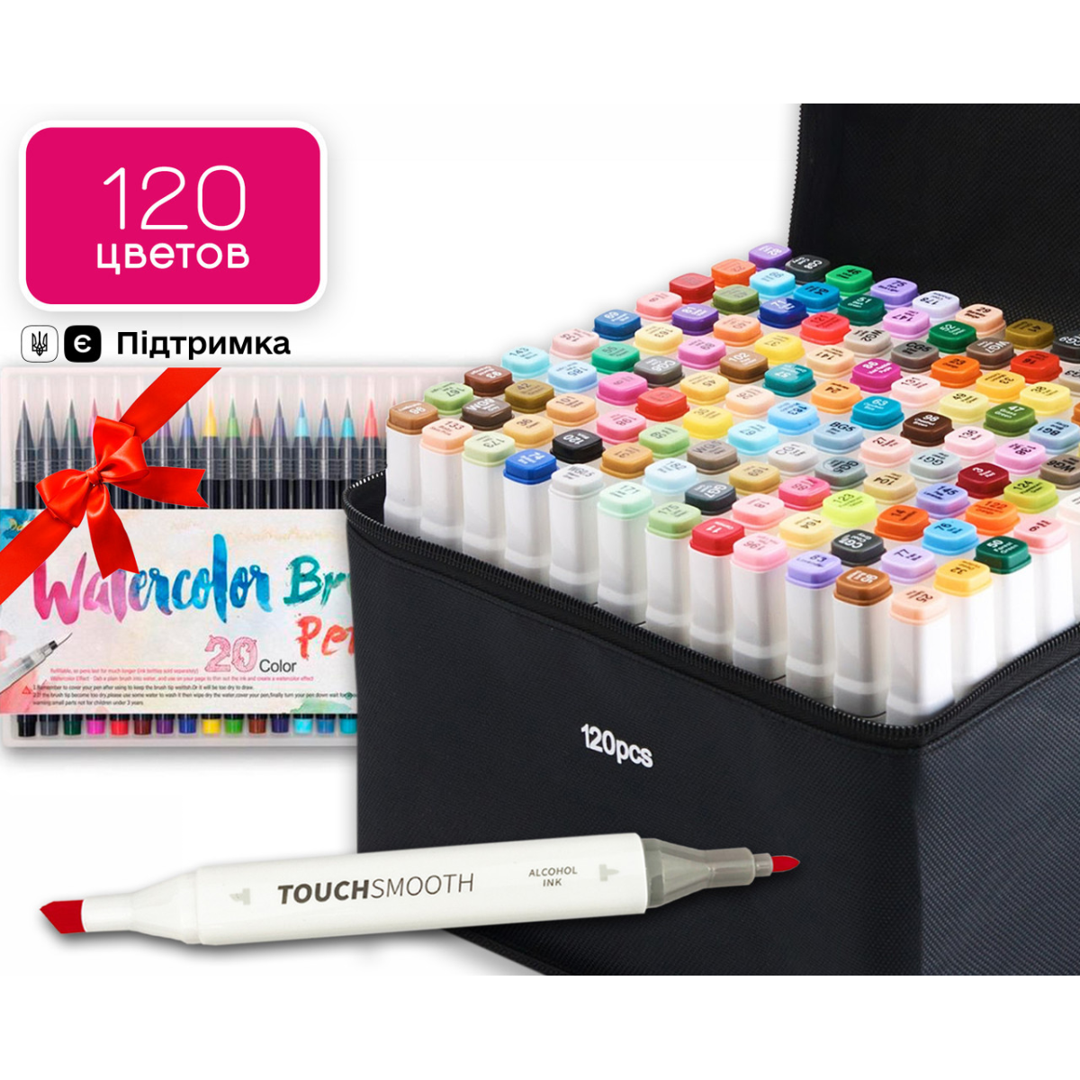 Ви купуєте Набір двосторонніх маркерів Touch Smooth для скетчинга на спиртовій основі 120 шт і разом з ними отримуєте Набір акварельних маркерів Water Color Brush маркер - пензлик 20 кольорів