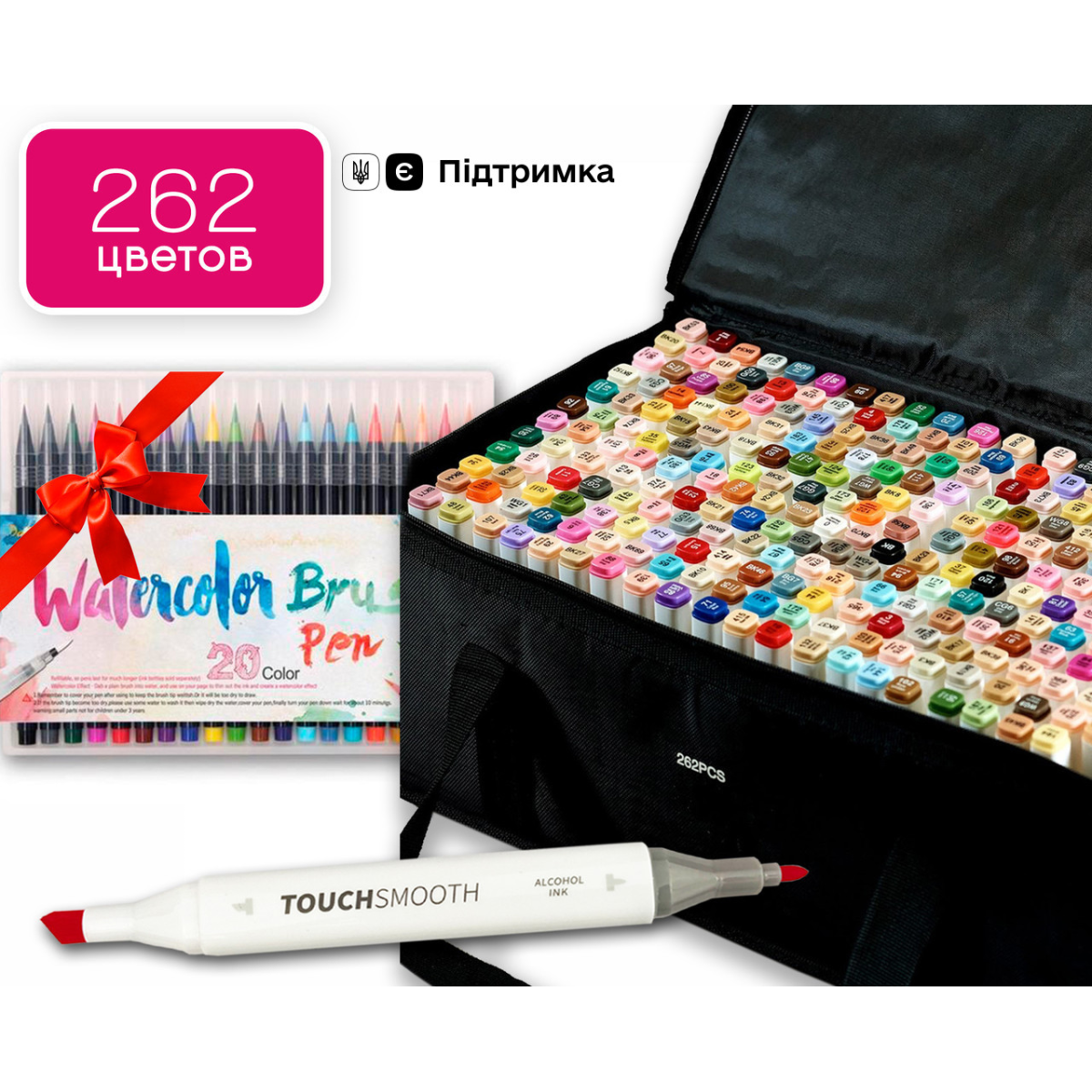 Ви купуєте Набір двосторонніх маркерів Touch Smooth для скетчинга на спиртовій основі 262 штук і разом з ними отримуєте Набір акварельних маркерів Water Color Brush маркер - пензлик 20 кольорів