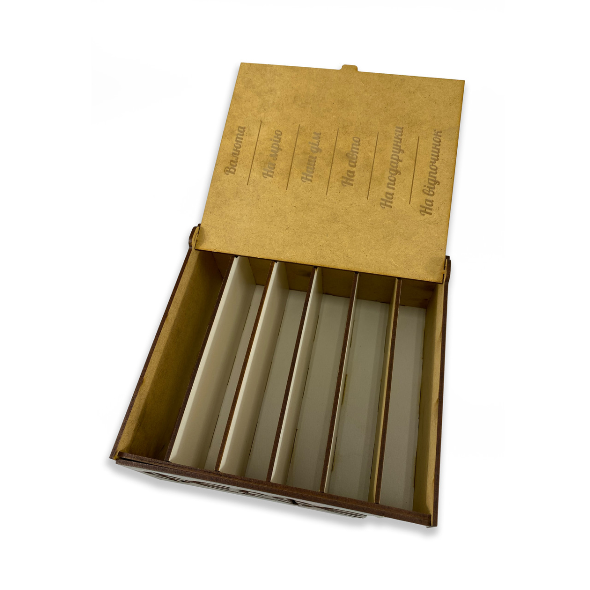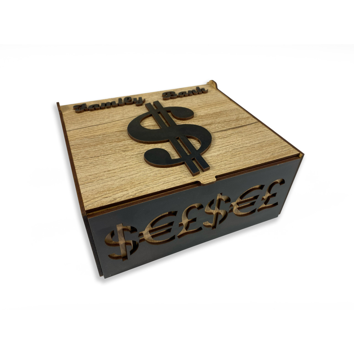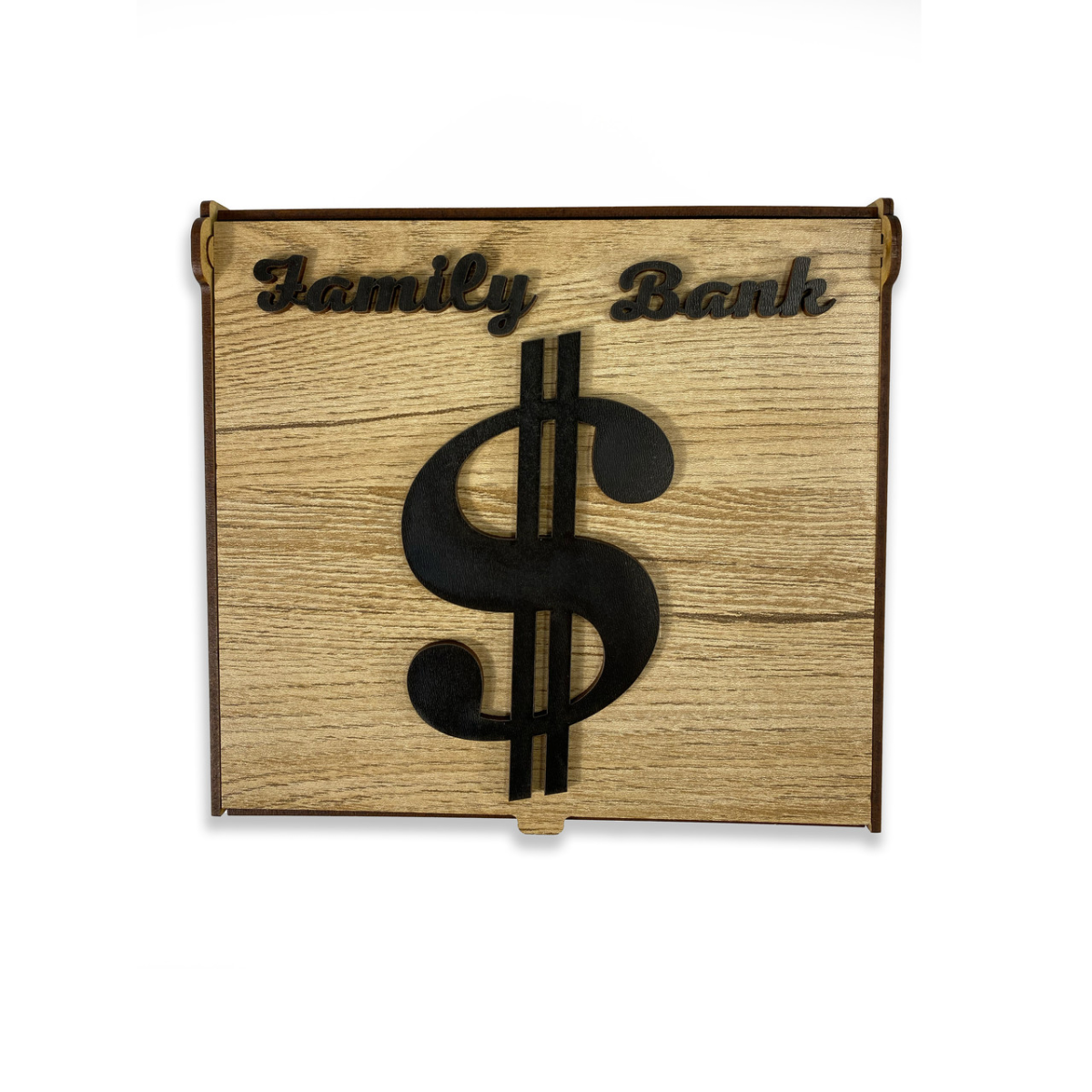Коробка-органайзер для грошей FAMILY BANK з натурального дерева з різьбленням та перфорацією, скарбничка 19x20x8,5 см
