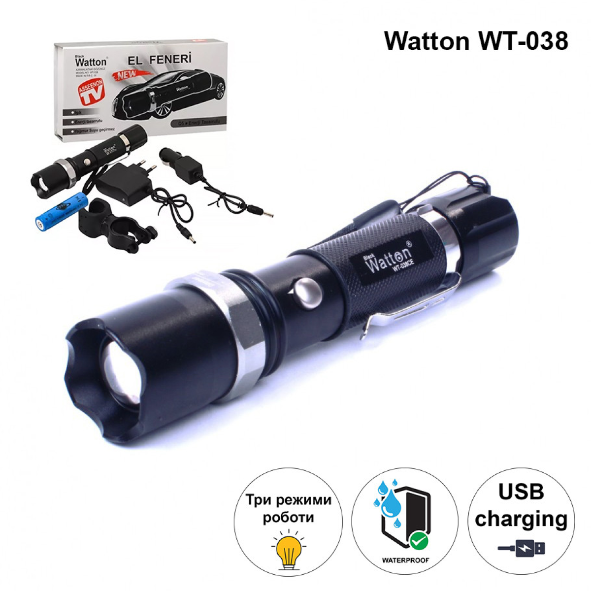 Акумуляторний світлодіодний тактичний ліхтар з лінзою Watton WT-038 металевий ударостійкий