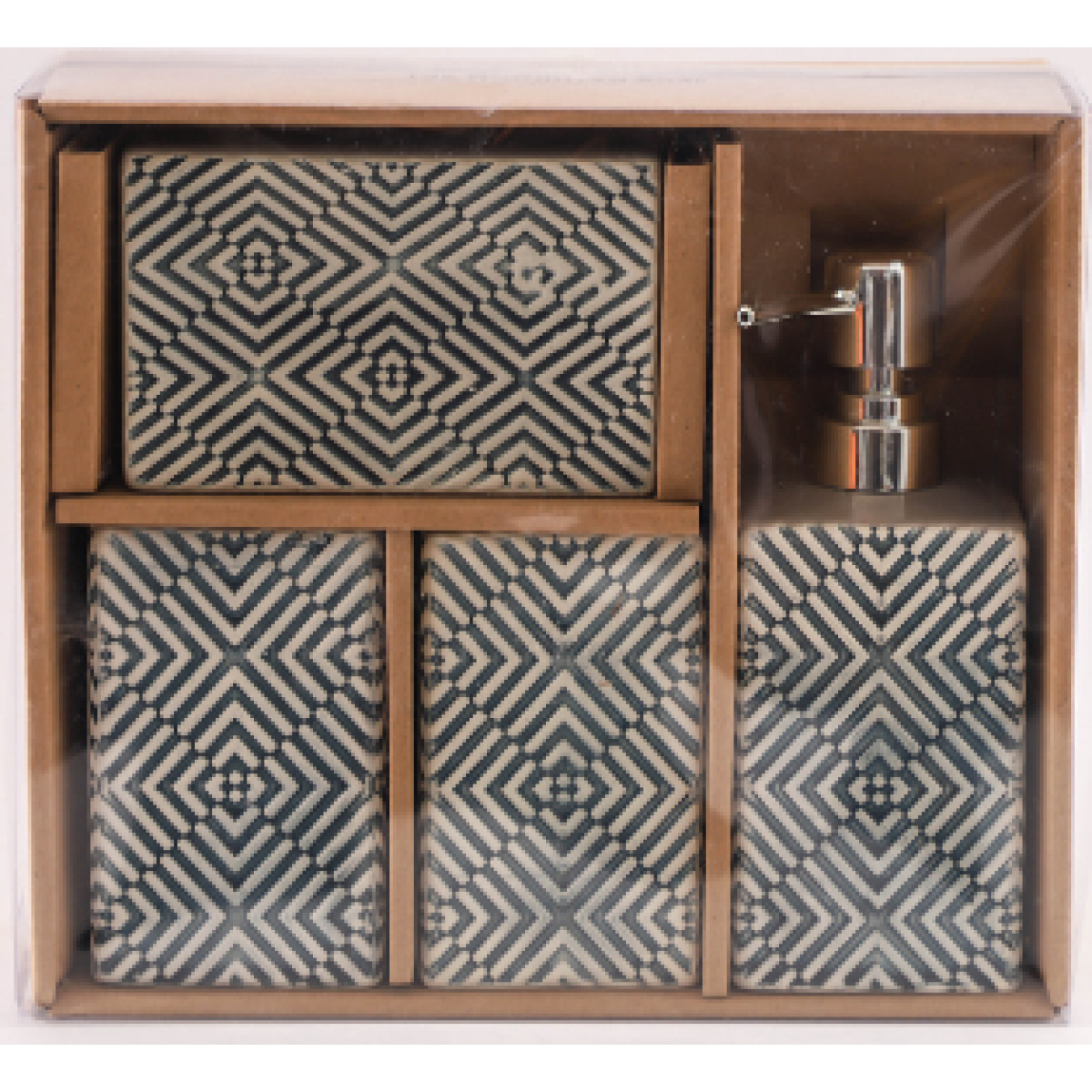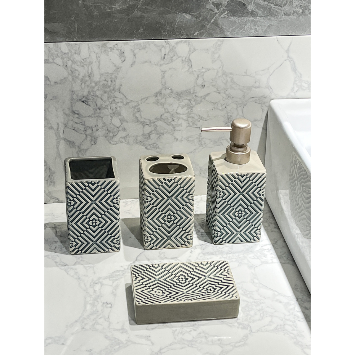 Набір керамічних аксесуарів для ванної кімнати в бежевому кольорі з ромбовим дизайном - це елегантний та практичний вибір для оформлення вашої ванної кімнати. Цей набір містить кілька елементів, які ідеально поєднують в собі якість та стиль. У наборі включено: Дозатор для мила: Керамічний дозатор в бежевому кольорі з ромбовим дизайном, який додає елегантний акцент до вашого ванного приміщення. Мильниця: Компактна керамічна мильниця в бежевому кольорі з ромбовим дизайном, яка ідеально підходить для миття рук або обличчя. 2 стакани: Два стильних стакани в бежевому кольорі з ромбовим дизайном забезпечують організоване зберігання зубних щіток, зубної пасти та інших аксесуарів для гігієни. Бежевий колір набору разом з ромбовим дизайном створює відчуття тепла та комфорту в вашій ванні кімнаті. Керамічні аксесуари відзначаються міцністю та довговічністю, що робить їх ідеальними для щоденного використання. Цей набір допоможе вам організувати простір ванної та зробить її більш стильною та зручною для вас та гостей.