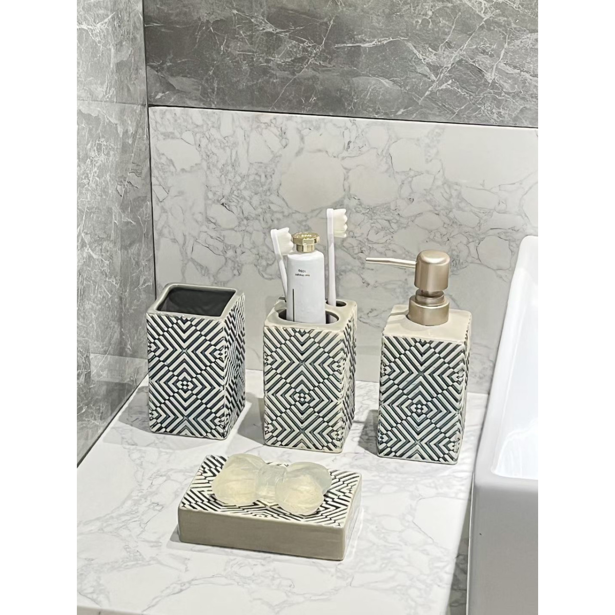 Дозатор, мильниця та стакани, Набір кераміних аксесуарів для ванної кімнати, Бежевий візерунок (текстура)