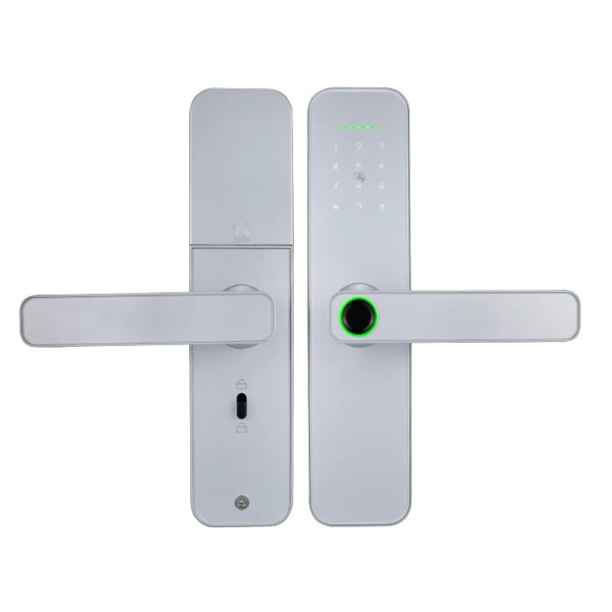 Цей розумний дверний замок KHS-F005 світло-сірого кольору пропонує передові технології для гарантування безпеки вашого будинку або офісу. Пристрій підтримує п“ять методів розблокування: відбиток пальця, пароль, картку, ключ і керування через Bluetooth-додаток. Завдяки такому різноманіттю способів доступу, замок зручний для всіх користувачів, включаючи членів сім“ї або співробітників. Виготовлений із міцного алюмінієвого сплаву, він поєднує надійність і довговічність.
