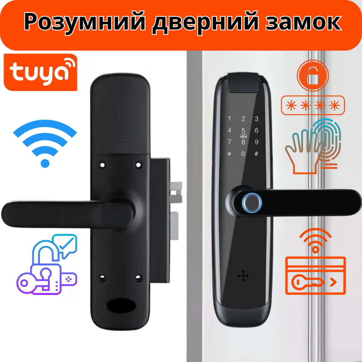 П“ять способів розблокування: застосунок, код, відбиток пальця, ключ-картка, механічний ключ.