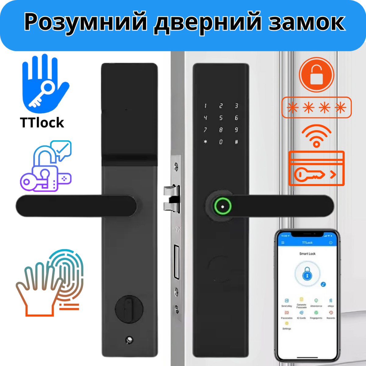 Відкриття пристрою Ідентифікація відбитка пальця, Кодонаборною клавіатурою, Ключем, З мобільного телефону, Ідентифікація особи геометрії
