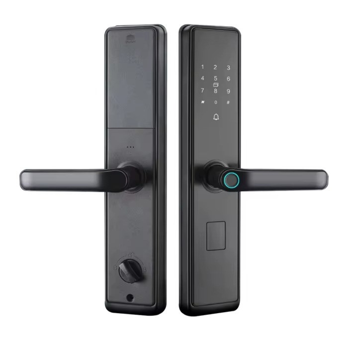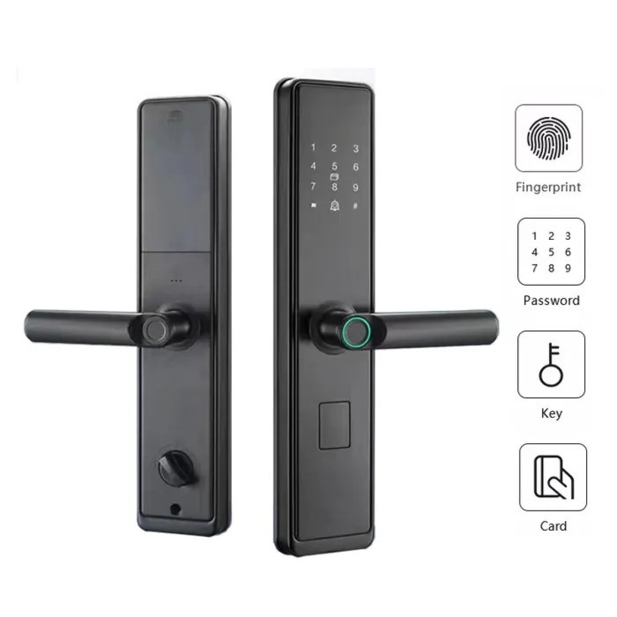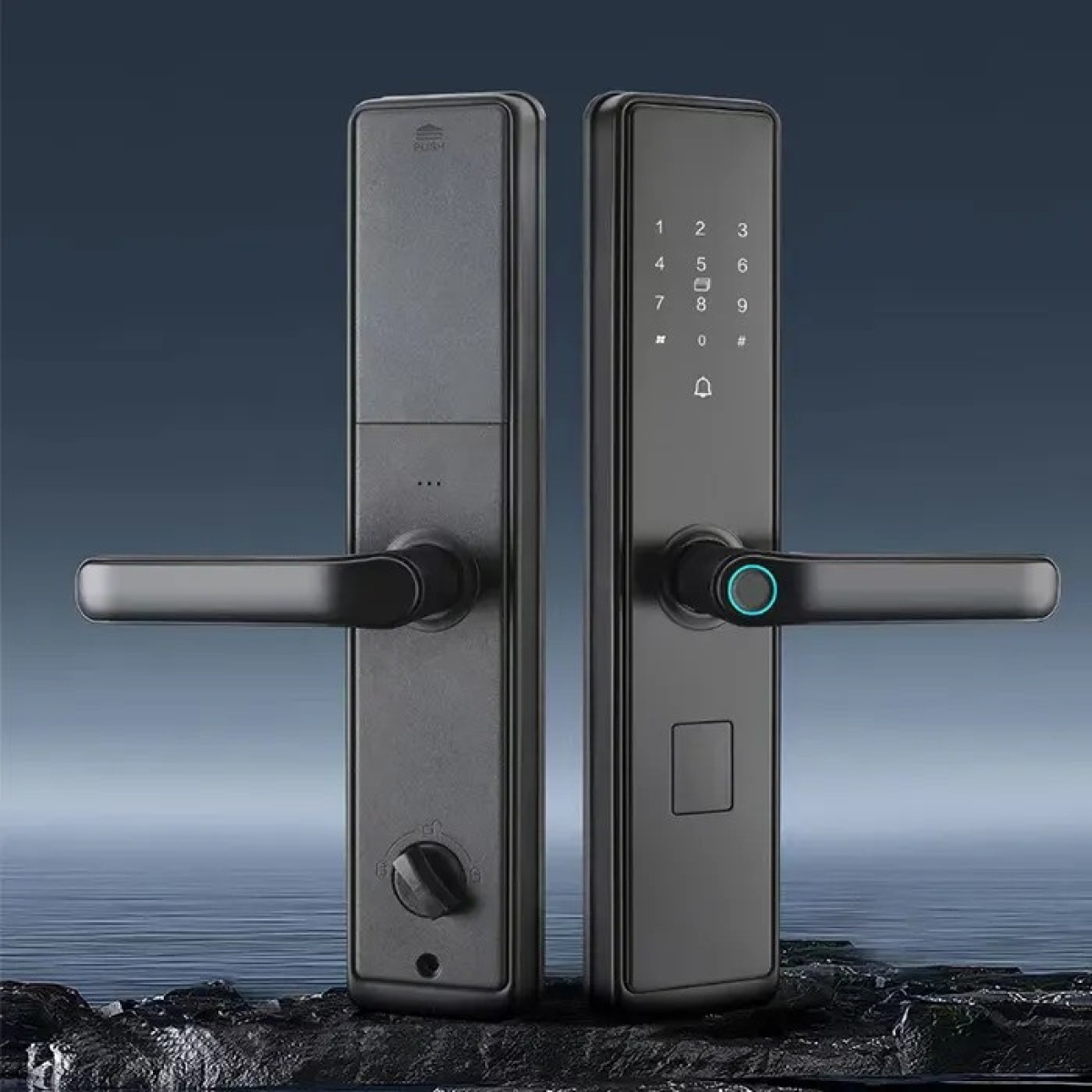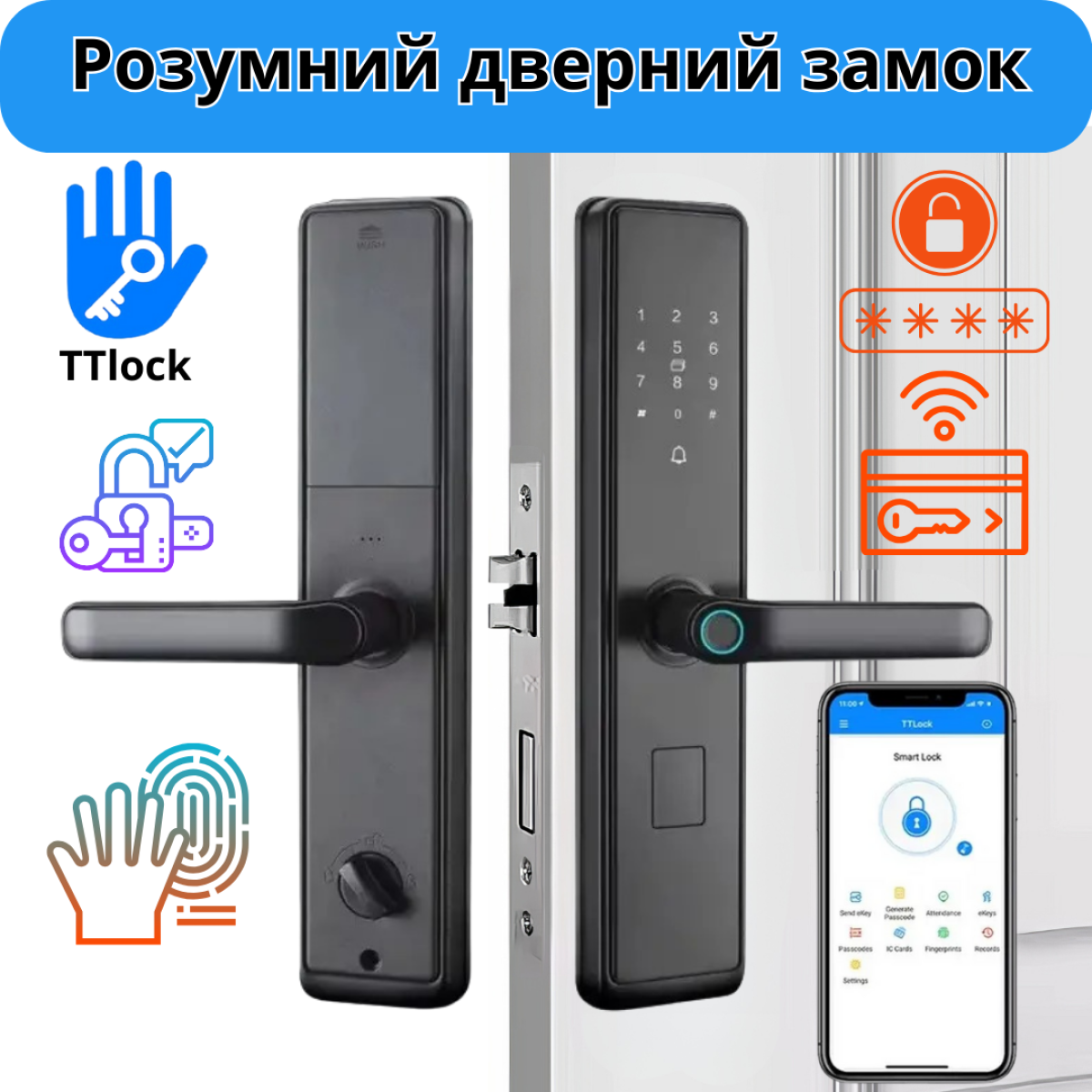 Розумний дверний замок KHS-S6 оснащений найсучаснішими функціями, включно з відчиненням за відбитком пальця, паролем і ключ-картою. Це робить доступ до вашого будинку зручним і безпечним. Для аварійних ситуацій передбачені механічний ключ і USB-вхід для підключення зовнішнього живлення. Керування замком здійснюється через додаток TTlock, який підтримує Bluetooth, даючи змогу дистанційно керувати пристроєм.