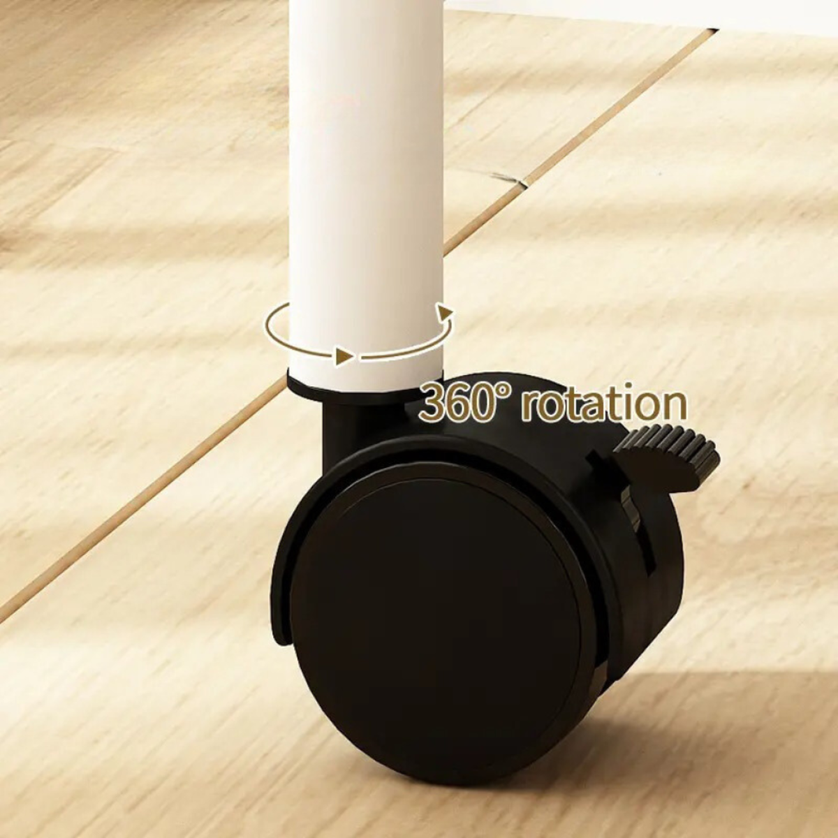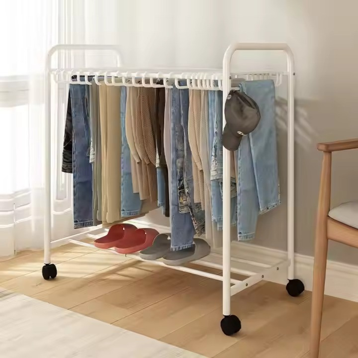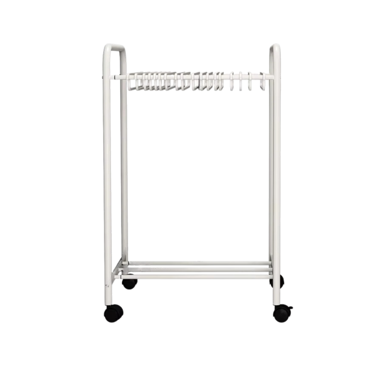 На вішалці передбачені пластикові колеса з функцією пересування, що робить її зручною для переміщення. У комплекті ви знайдете 22 пластикових тремпеля, спеціально розроблених для штанів і штанів, які допоможуть зберегти форму одягу без заломів. Нижня полиця додає додатковий простір для зберігання взуття, забезпечуючи функціональне використання вертикального простору.