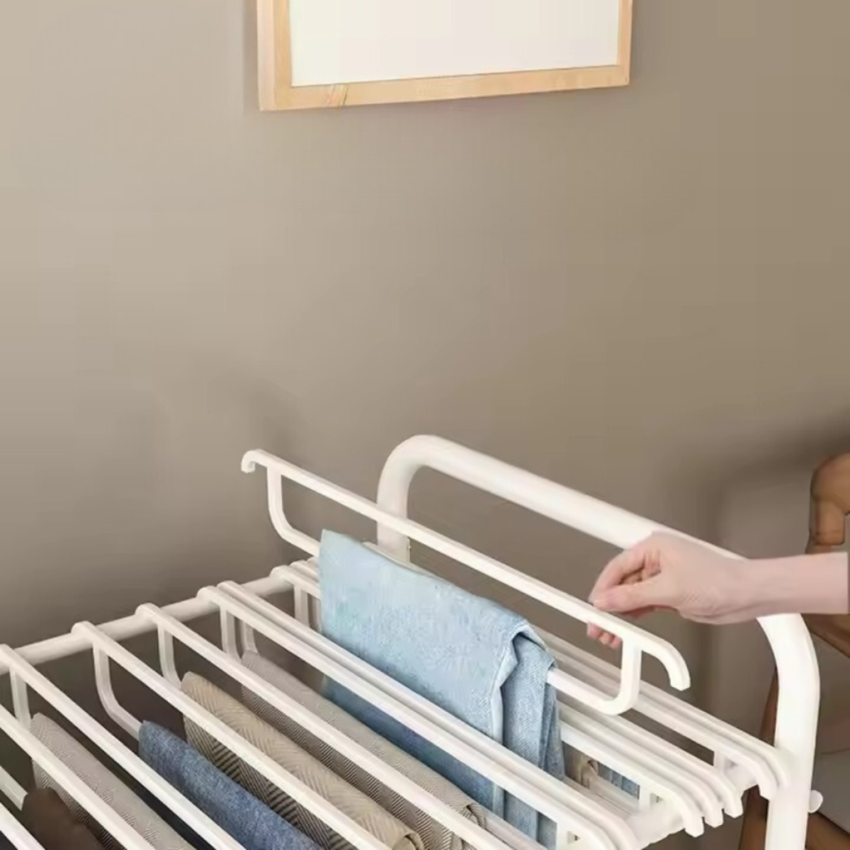 Ця підлогова вішалка створена спеціально для зручного зберігання до 22 пар спідниць або штанів, пропонуючи рішення для організованого розміщення речей в обмеженому просторі. Завдяки конструкції з трансформованою шириною, вішалка адаптується під ваші потреби - від 52 до 81 см, даючи змогу ефективно використовувати простір, чи то в гардеробі, чи то в спальні, чи то в передпокої. Виготовлена з металу, вішалка забезпечує надійну і стійку підтримку для кожного предмета одягу.
