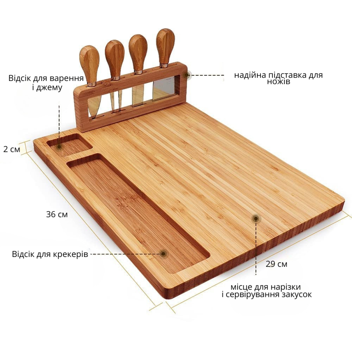 Дошка для сиру і закусок з ножами і соусником, бамбукова, сервірувальна менажниця дерев“яна розмір 36×29×2 см
