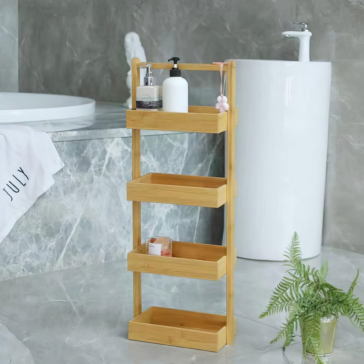 Багаторівнева полиця з бамбука - стильне і функціональне рішення для зберігання у ванній кімнаті. Цей компактний стелаж з розмірами 28×18×84 см вагою всього 3.2 кг стане ідеальним місцем для зберігання рушників, косметики, засобів особистої гігієни та інших аксесуарів. Завдяки універсальному дизайну, полиця прекрасно вписується в будь-який інтер“єр, додаючи затишок і природність. Виготовлена з високоякісного бамбука, який вирізняється довговічністю та стійкістю до вологості, що робить виріб ідеальним вибором для використання в приміщеннях із підвищеною вологістю. Полицю оснащено кількома рівнями, що дає змогу ефективно організувати простір і підтримувати порядок у домі. Характеристики: Матеріал: бамбук Розмір: 28×18×84 см Вага: 3.2кг